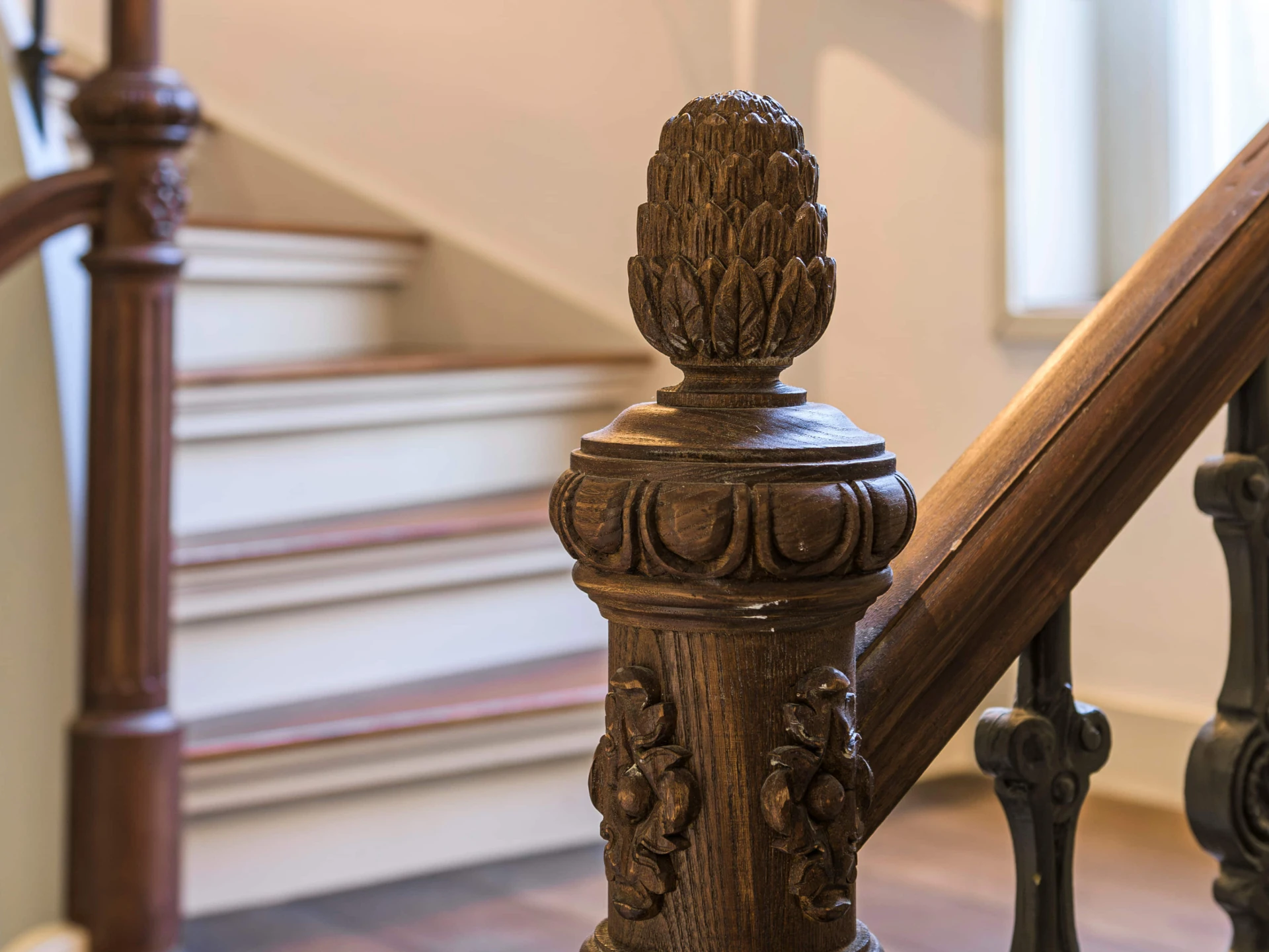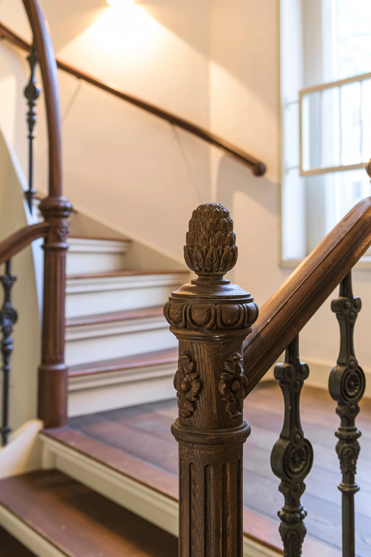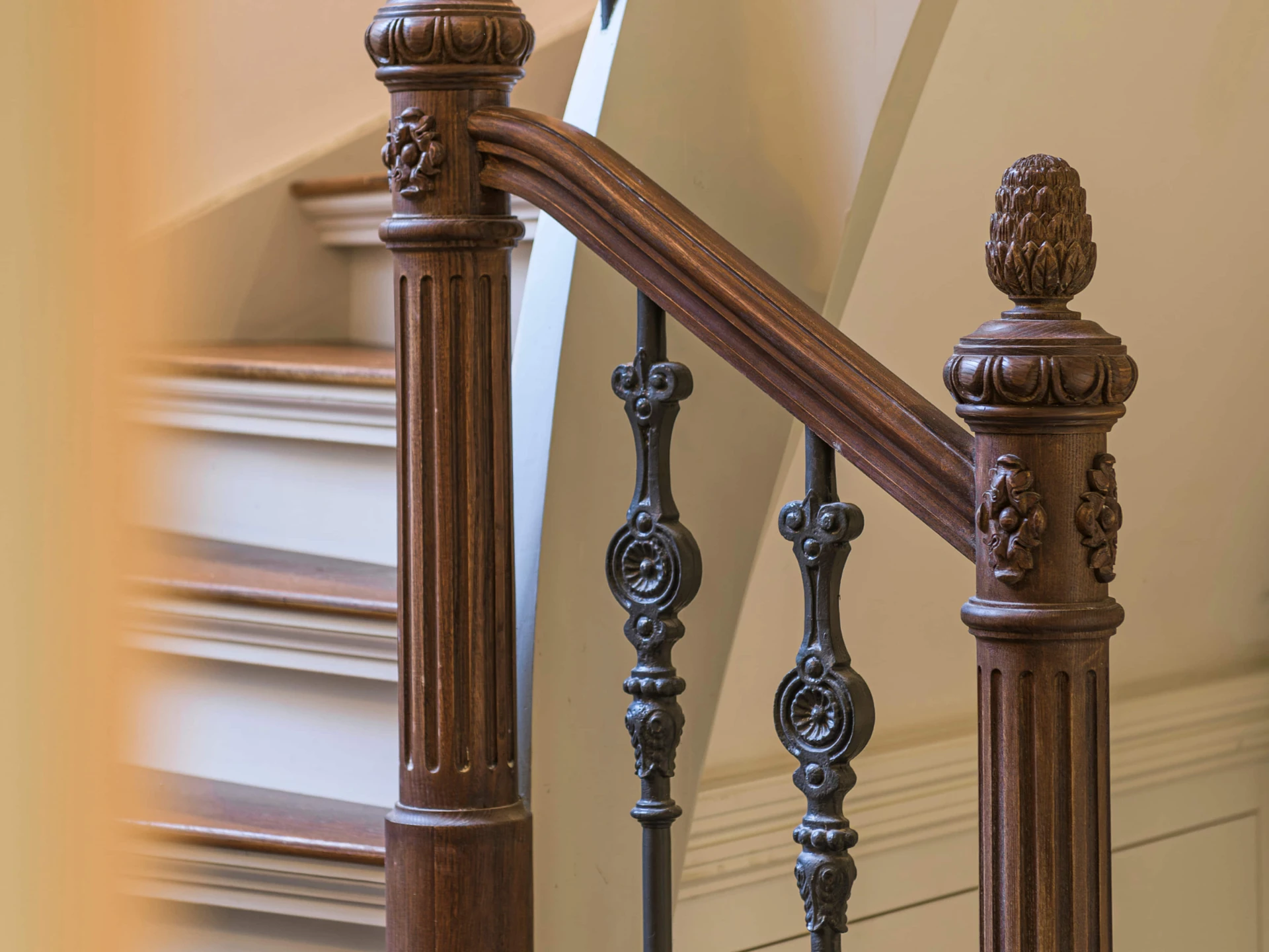 Deze trap ademt klassieke grandeur. Met een handgesneden hoofdbaluster, rijk bewerkte spijlen en een houten leuning die soepel de rondingen volgt, is dit niet zomaar een trap – het is een architectonisch statement. De warme Dark Oak olieafwerking maakt het geheel tijdloos en rijk.