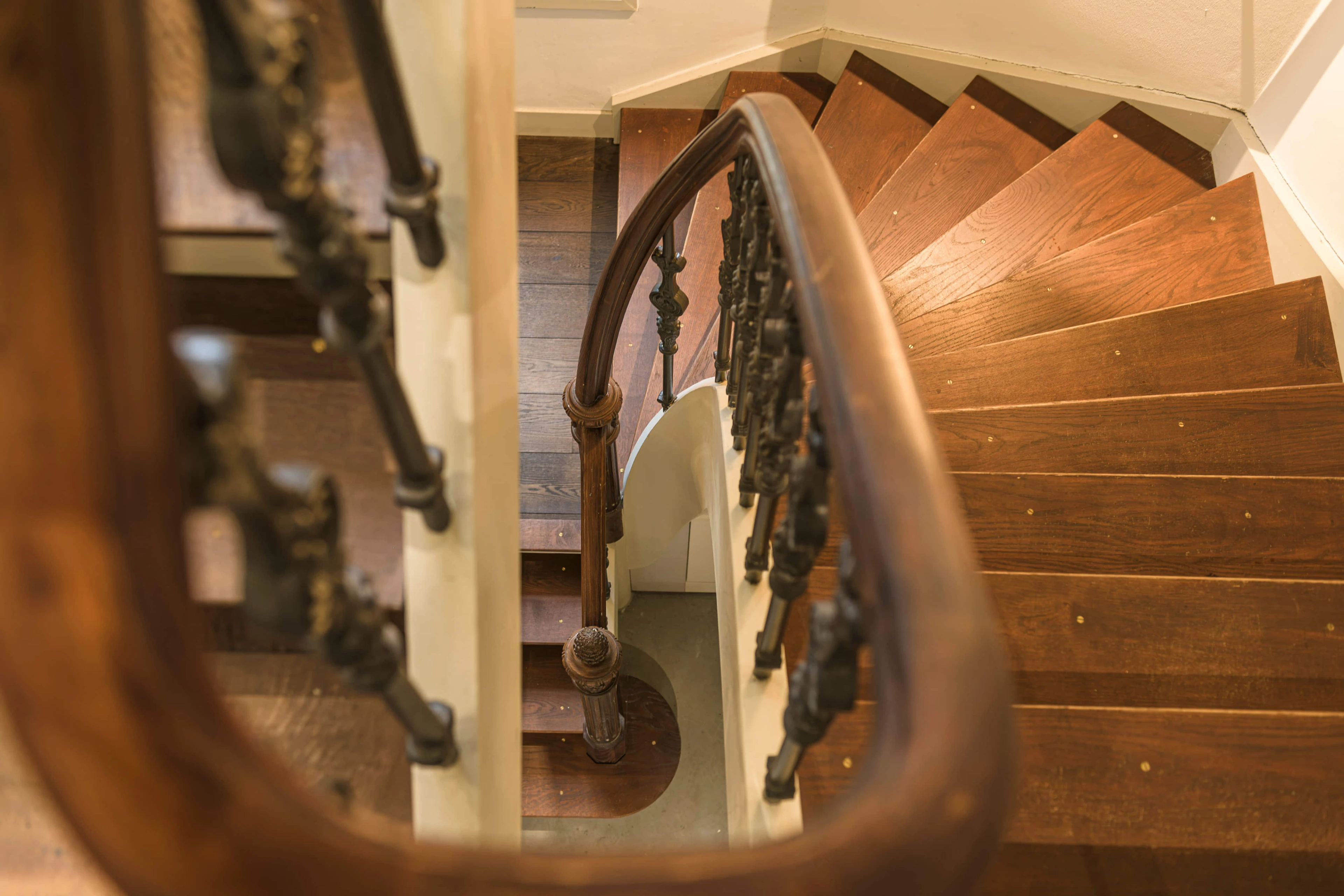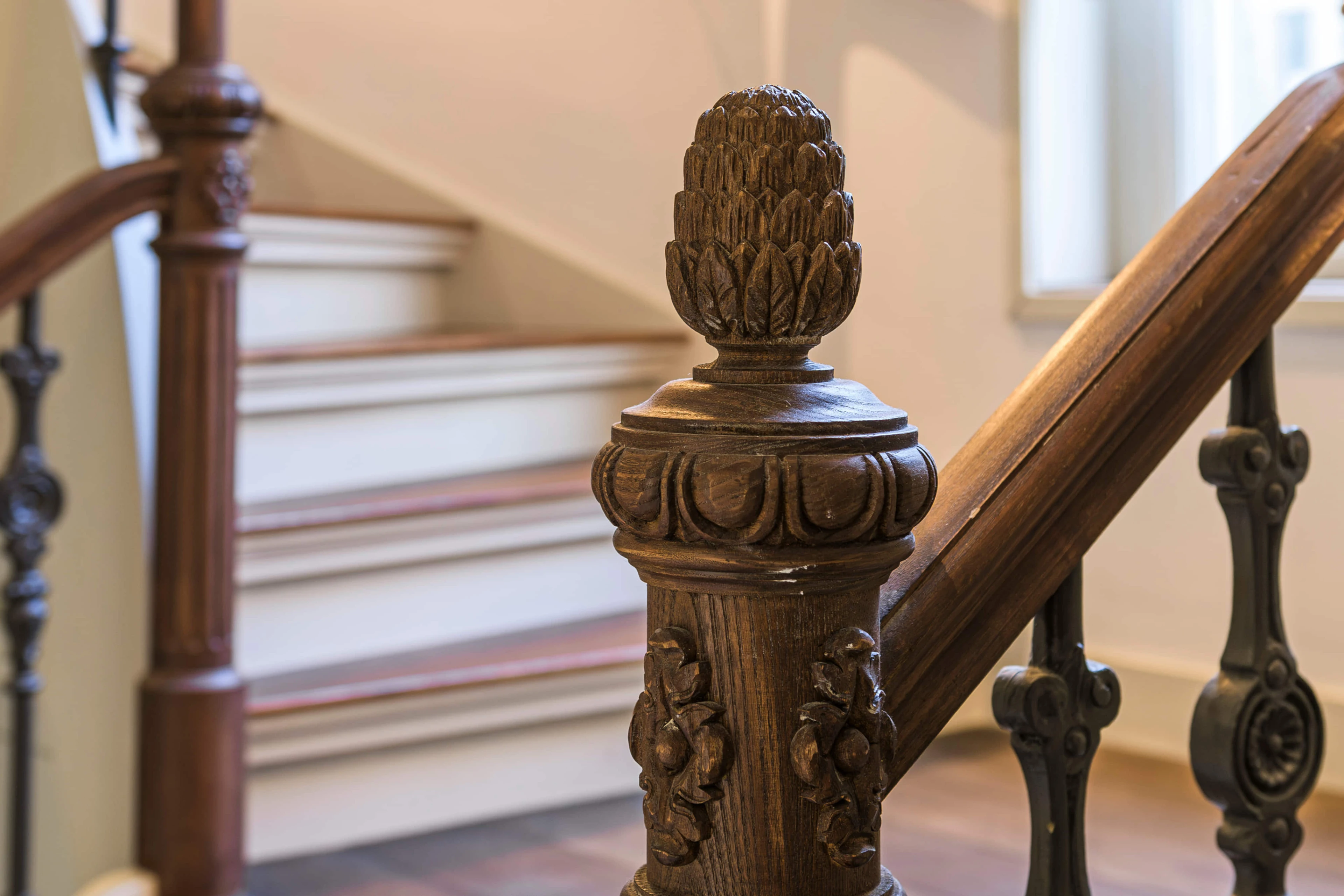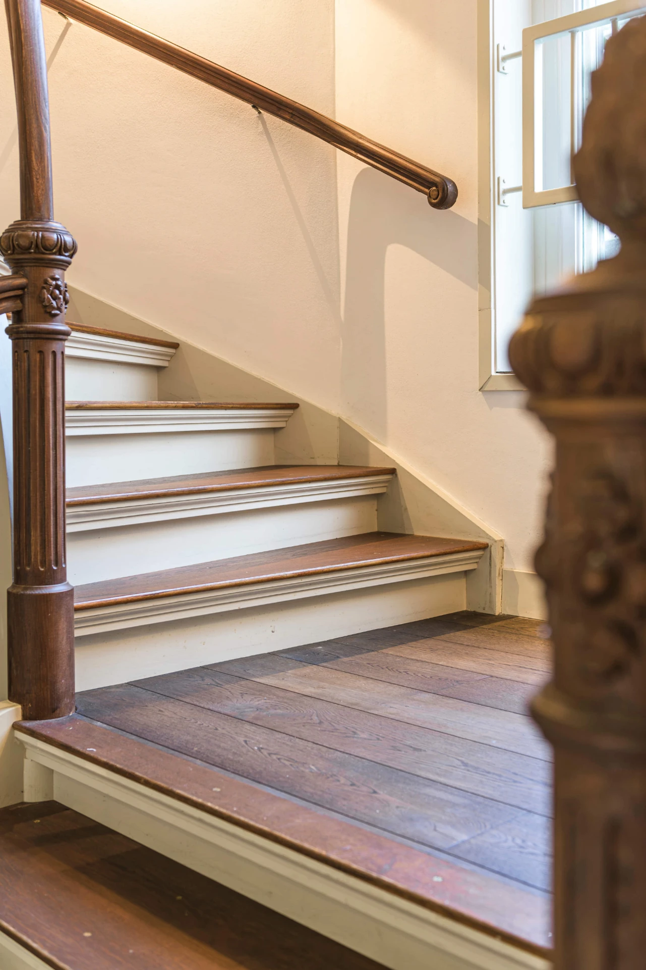 Deze trap ademt klassieke grandeur. Met een handgesneden hoofdbaluster, rijk bewerkte spijlen en een houten leuning die soepel de rondingen volgt, is dit niet zomaar een trap – het is een architectonisch statement. De warme Dark Oak olieafwerking maakt het geheel tijdloos en rijk.