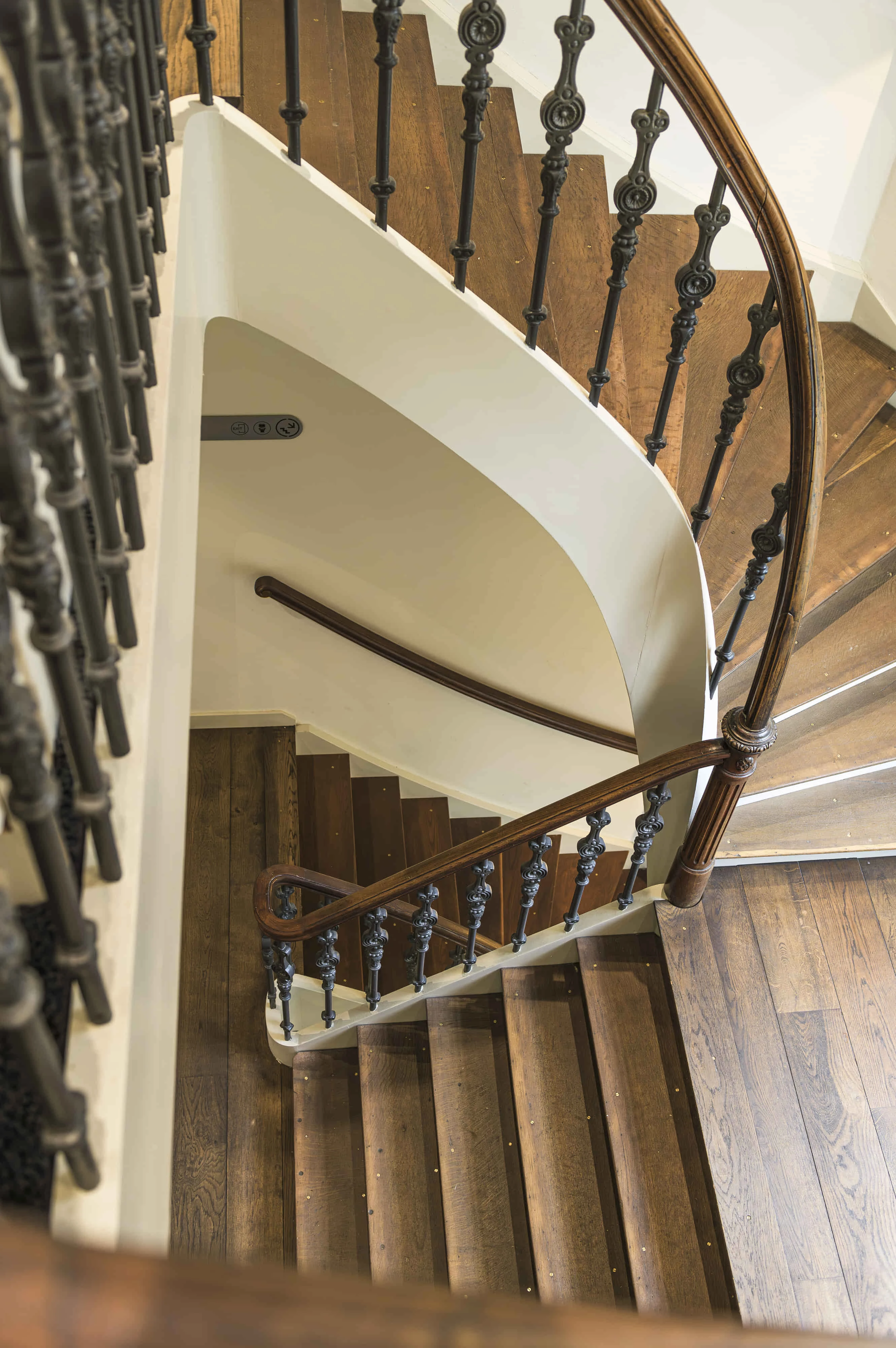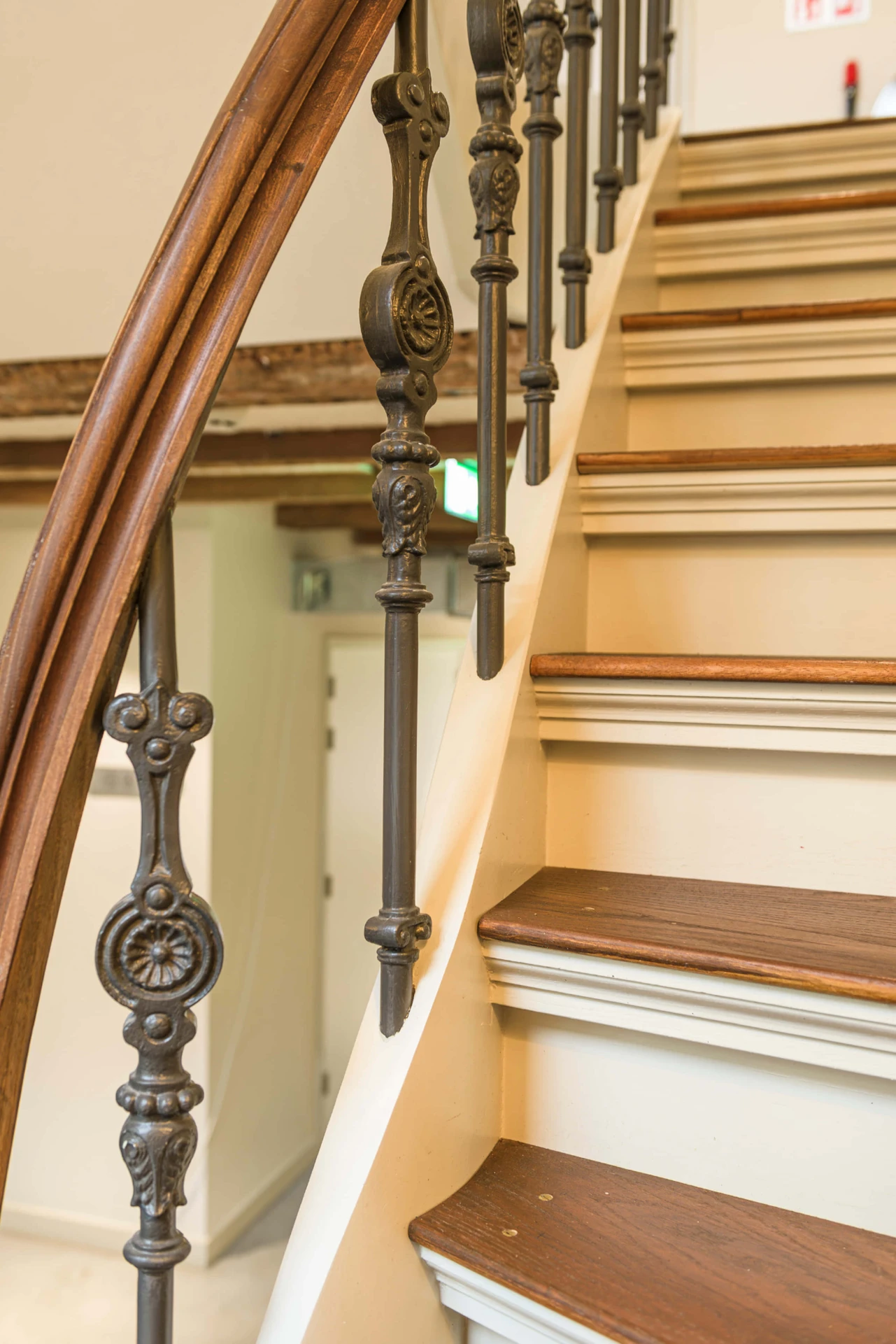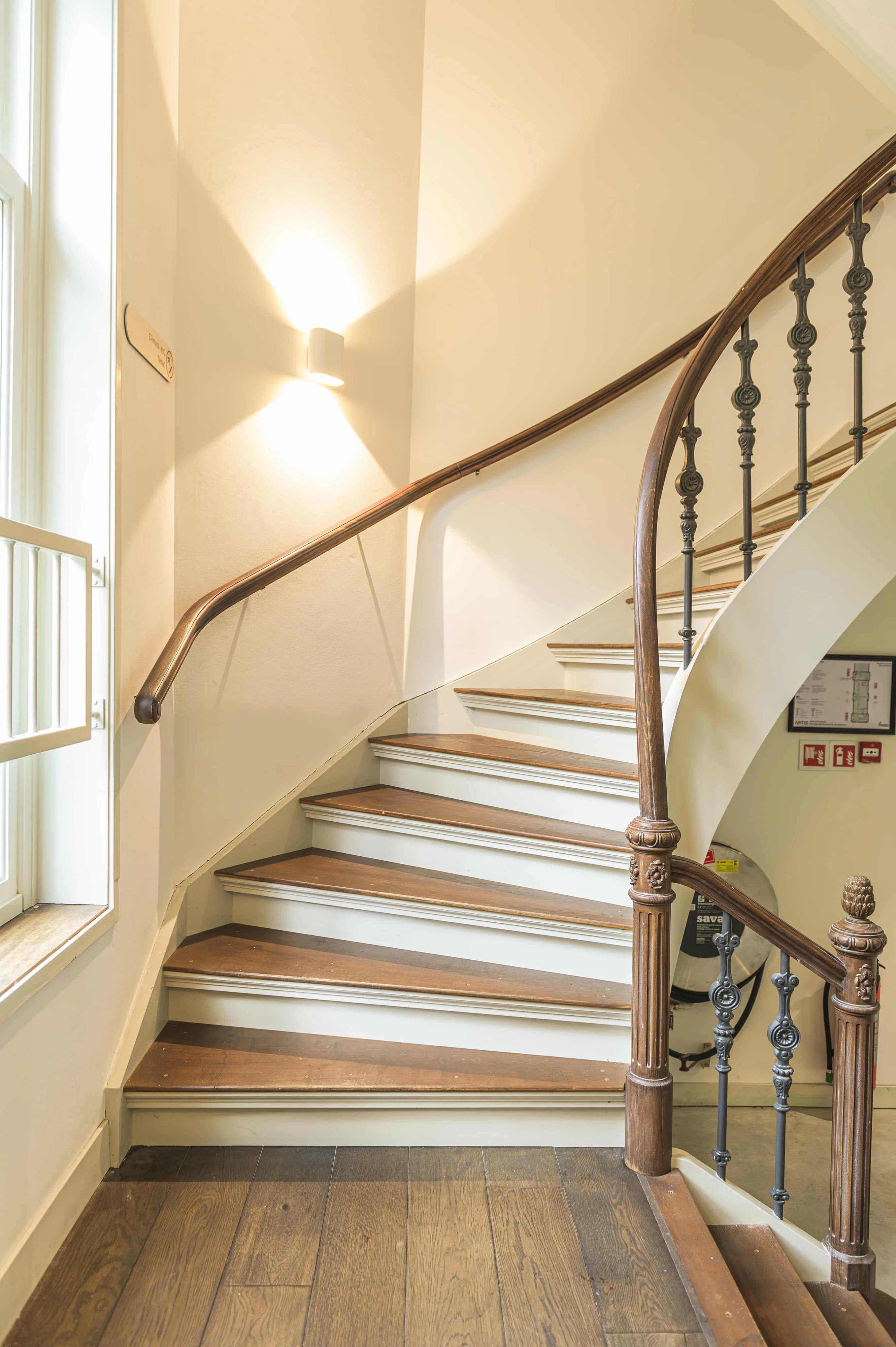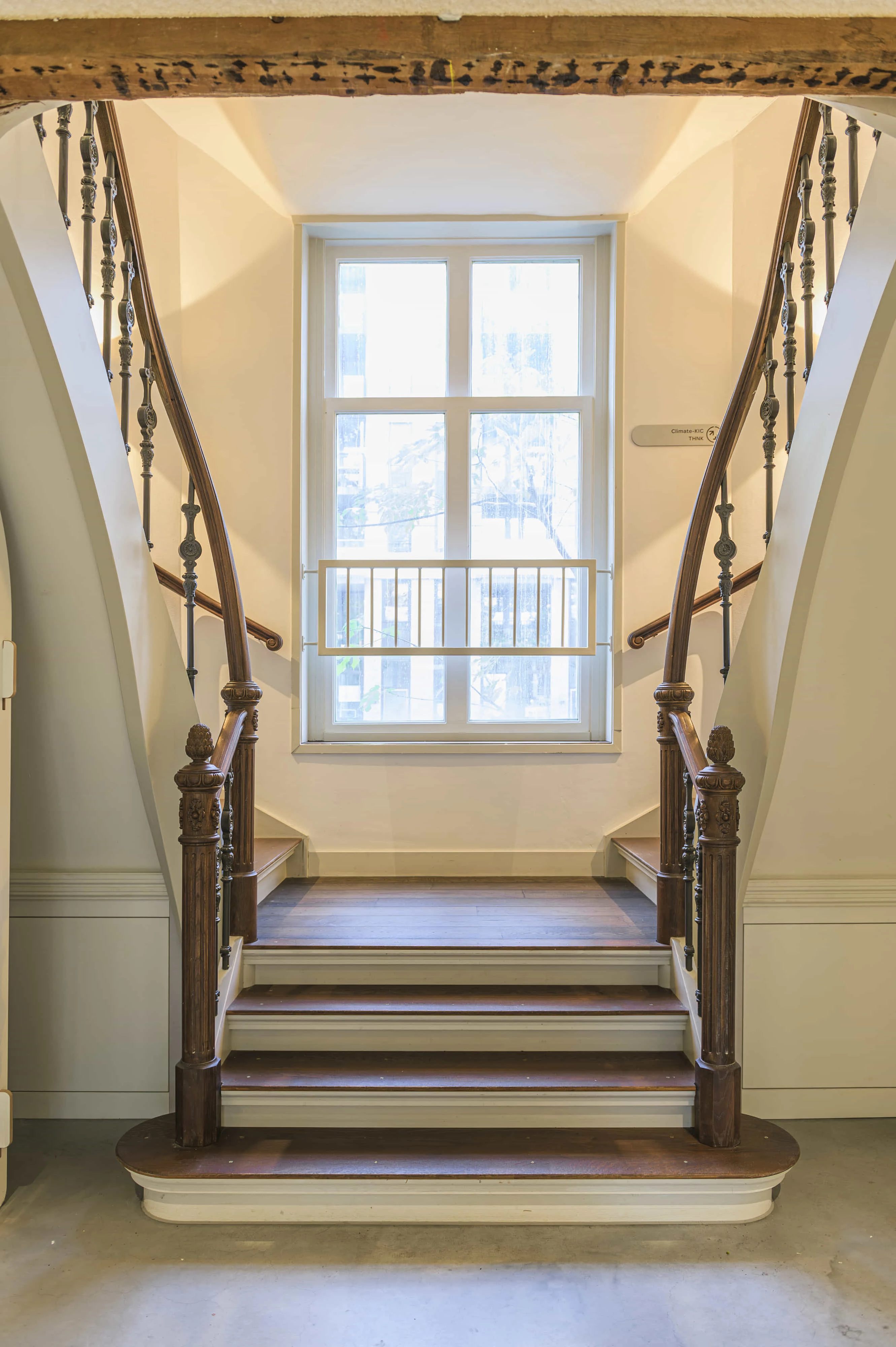 Twee kwartslagtrappen met bordes, opgaand vanuit één steektrap. Symmetrisch opgebouwd met dubbele traparmen en breed tussenbordes