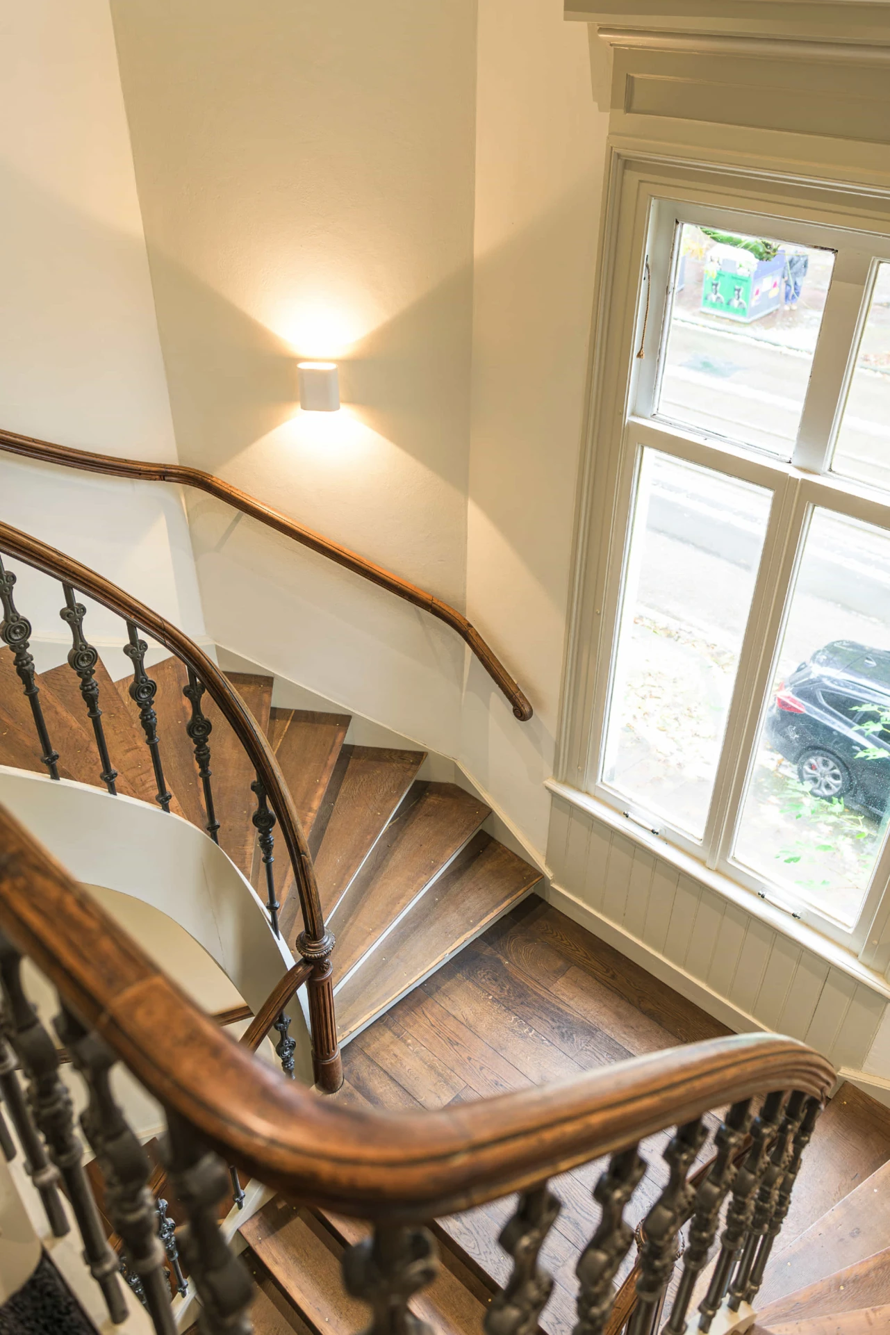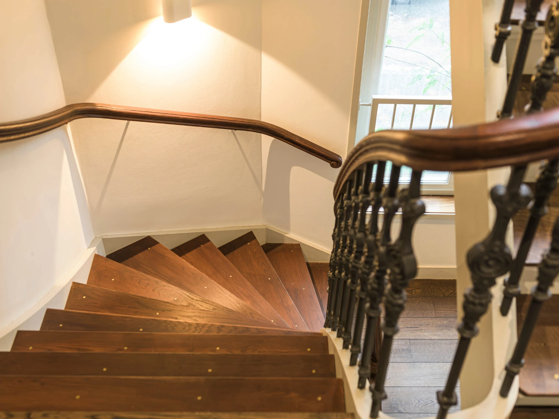Eikenhout, Rubio Monocoat Dark Oak, smeedijzeren spijlen, houten trapleuning
