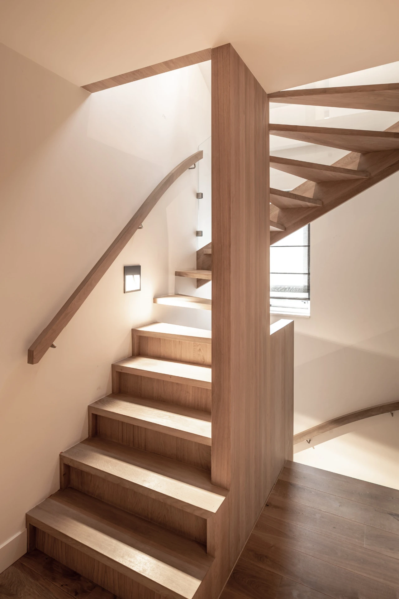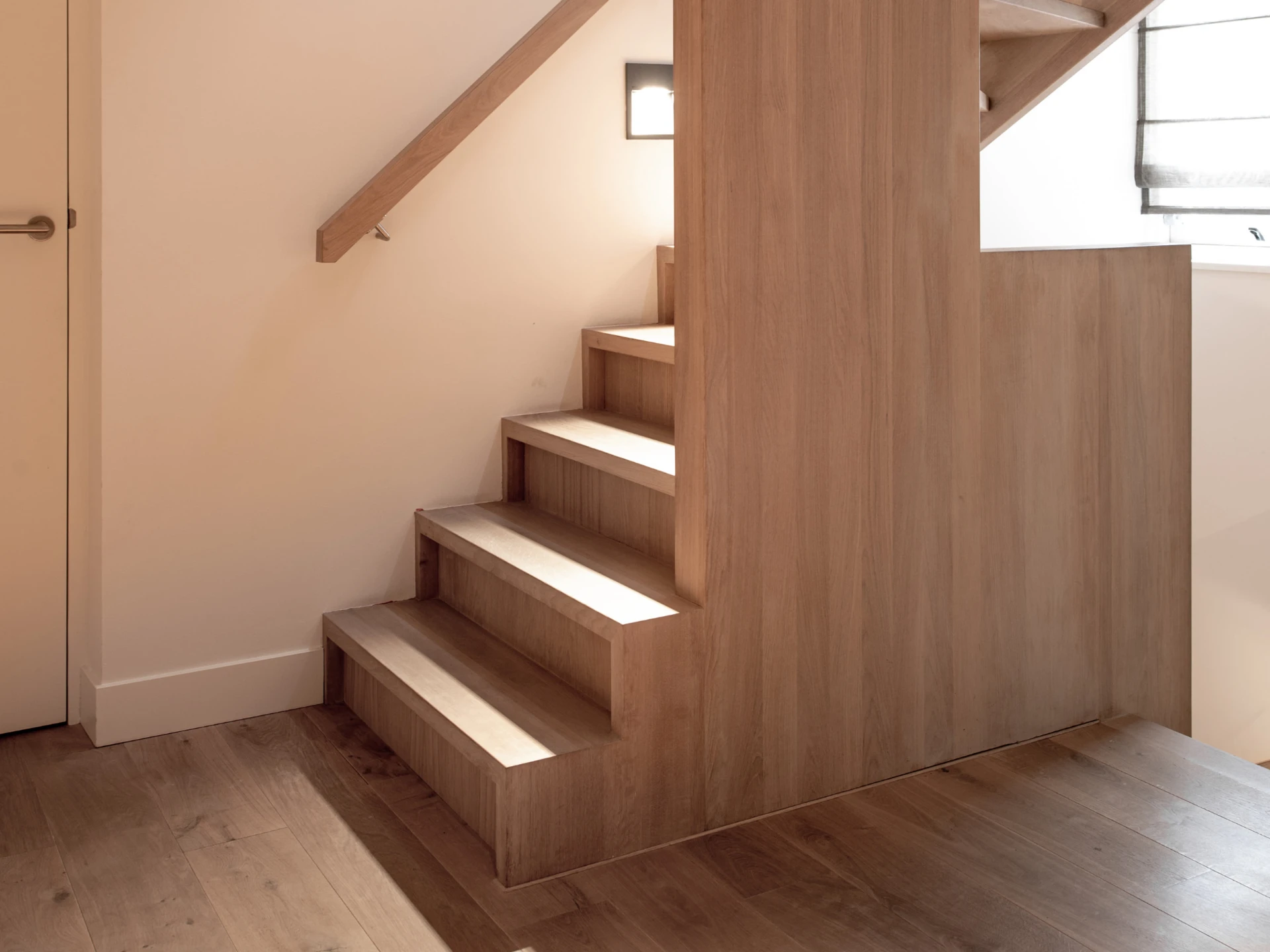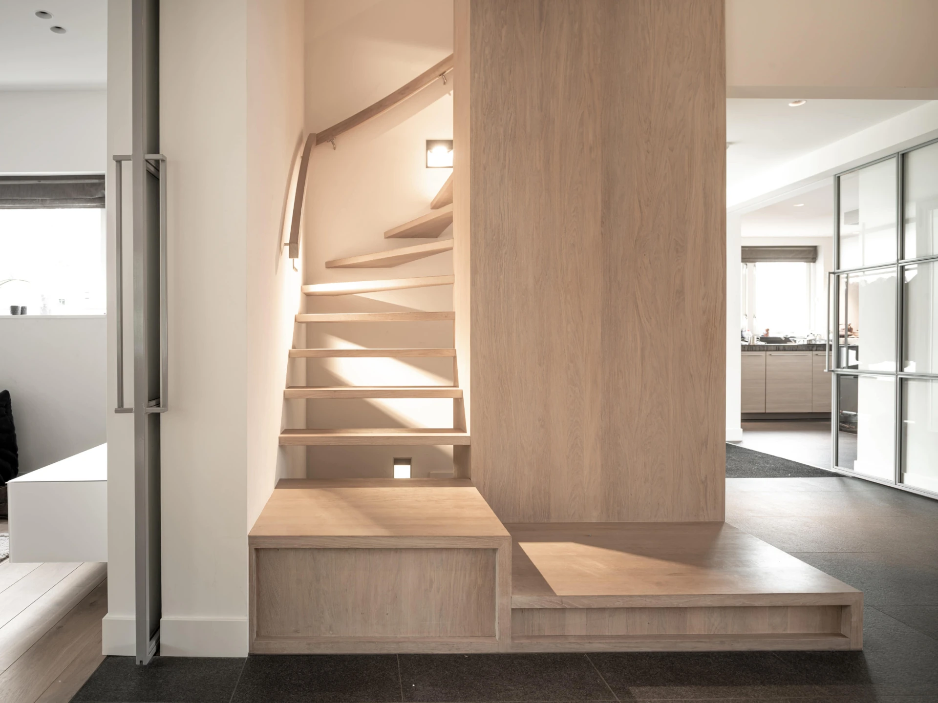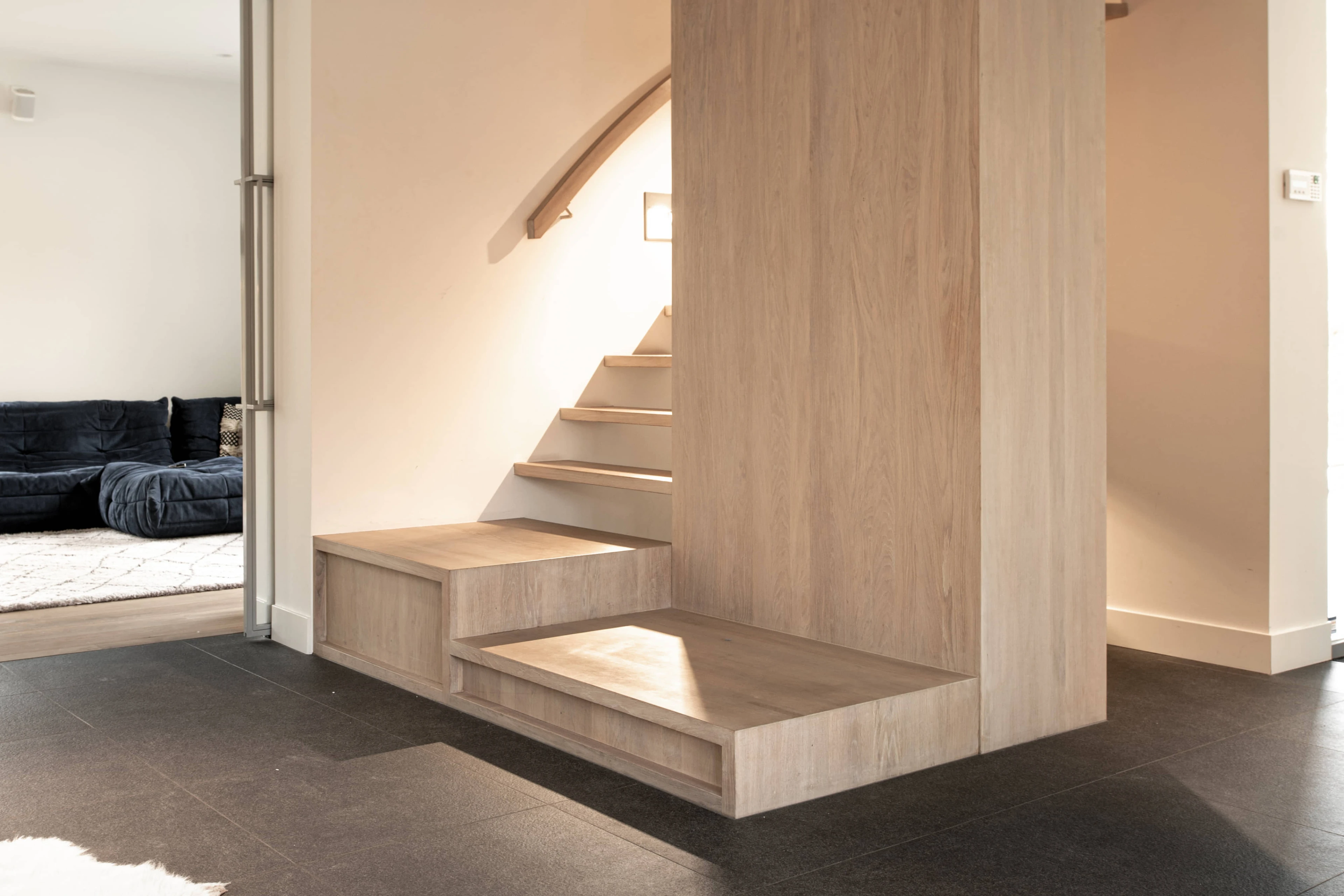 Open trap met geïntegreerde kastruimte in de onderste treden. Modern, warm en slim ontworpen.