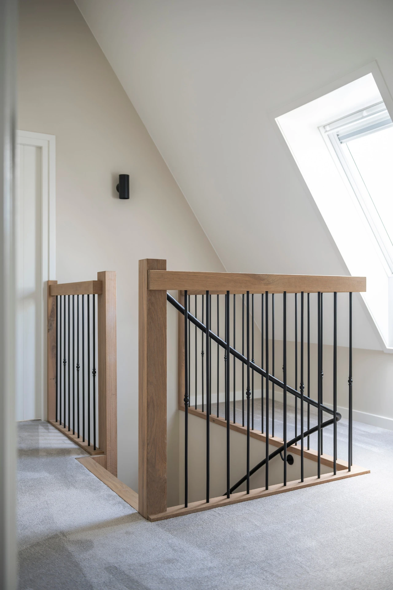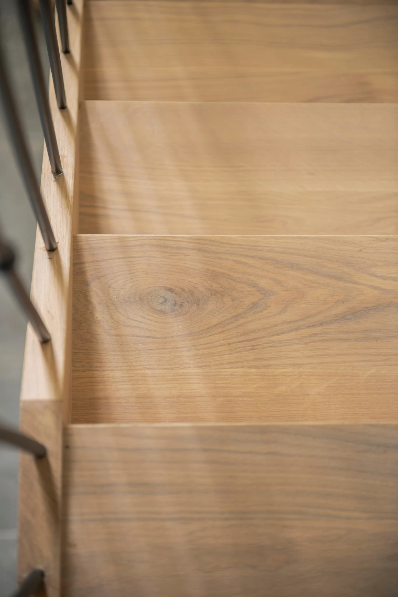 Rubio Monocoat Oyster olie, half open trap met keepbomen en standaard trapbomen, open treden zonder stootborden, houten leuning in olie, standaard trapbomen.