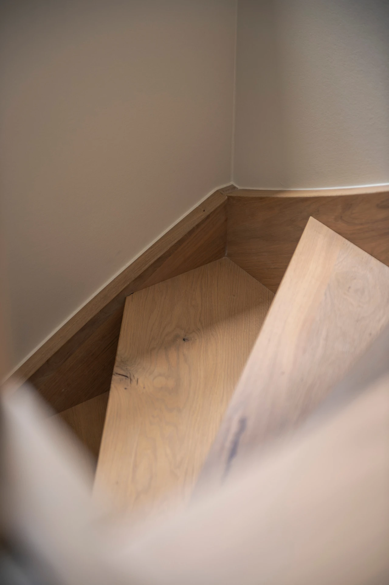 Een trap als meubelstuk. De eerste zes treden van deze open houten trap zijn uitgevoerd als op maat gemaakte schoenenkast. De combinatie van keepbomen en standaard trapbomen geeft deze trap een subtiele gelaagdheid. De afwerking in Rubio Monocoat Oyster geeft het geheel een warme, moderne uitstraling. Perfect in balans met de vloer en ruimte eromheen.