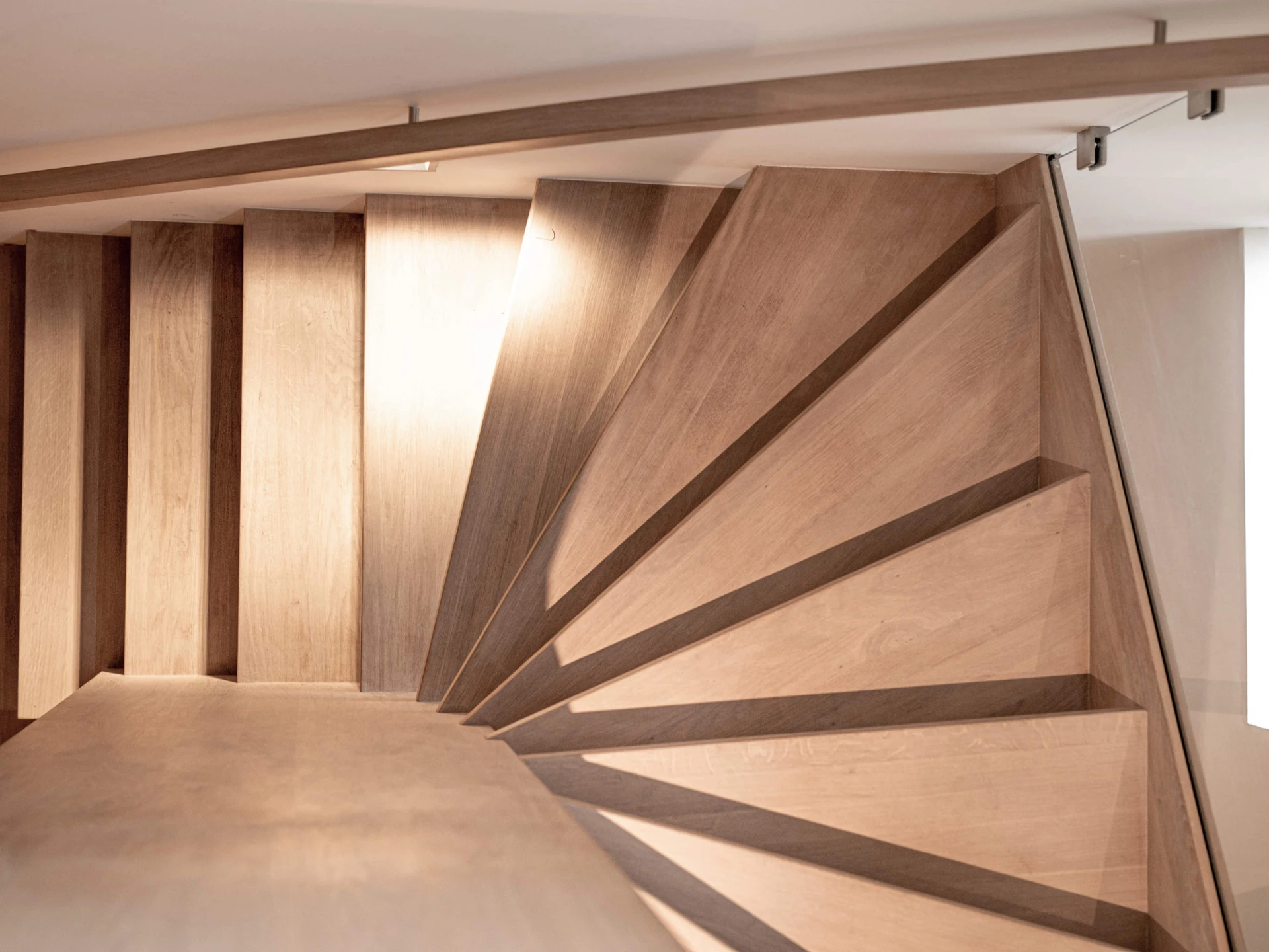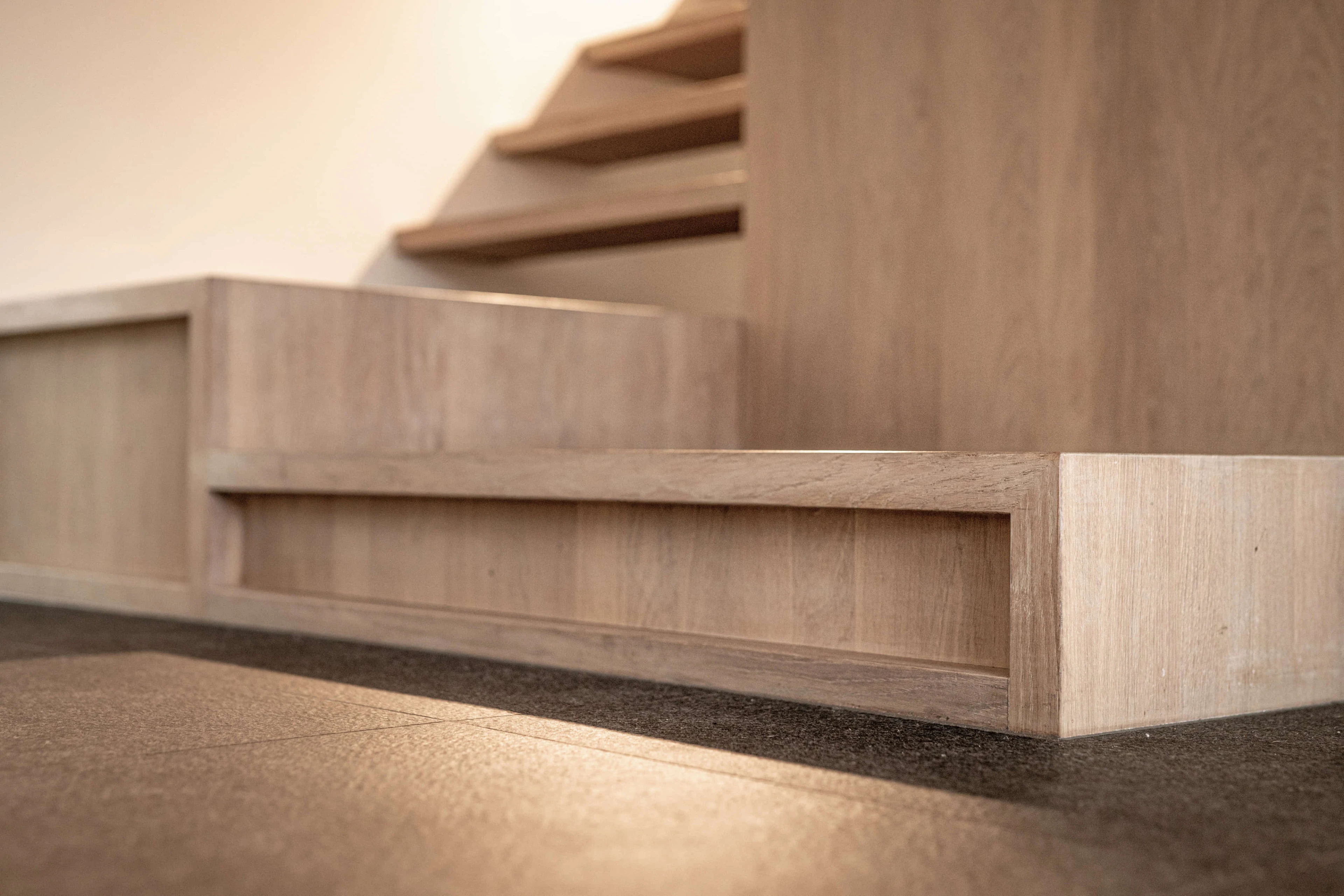 Massief hout in Rubio Monocoat Oyster, treden met geïntegreerde kastruimte, houten trapleuning met rvs dragers.