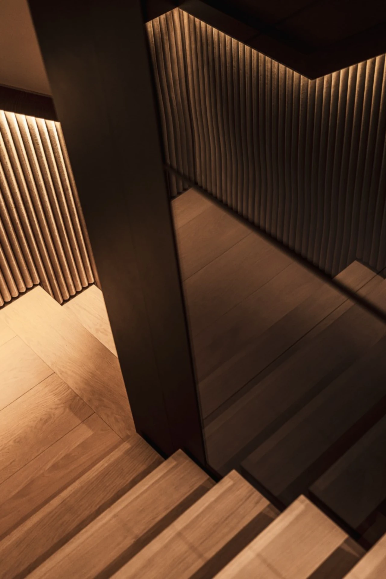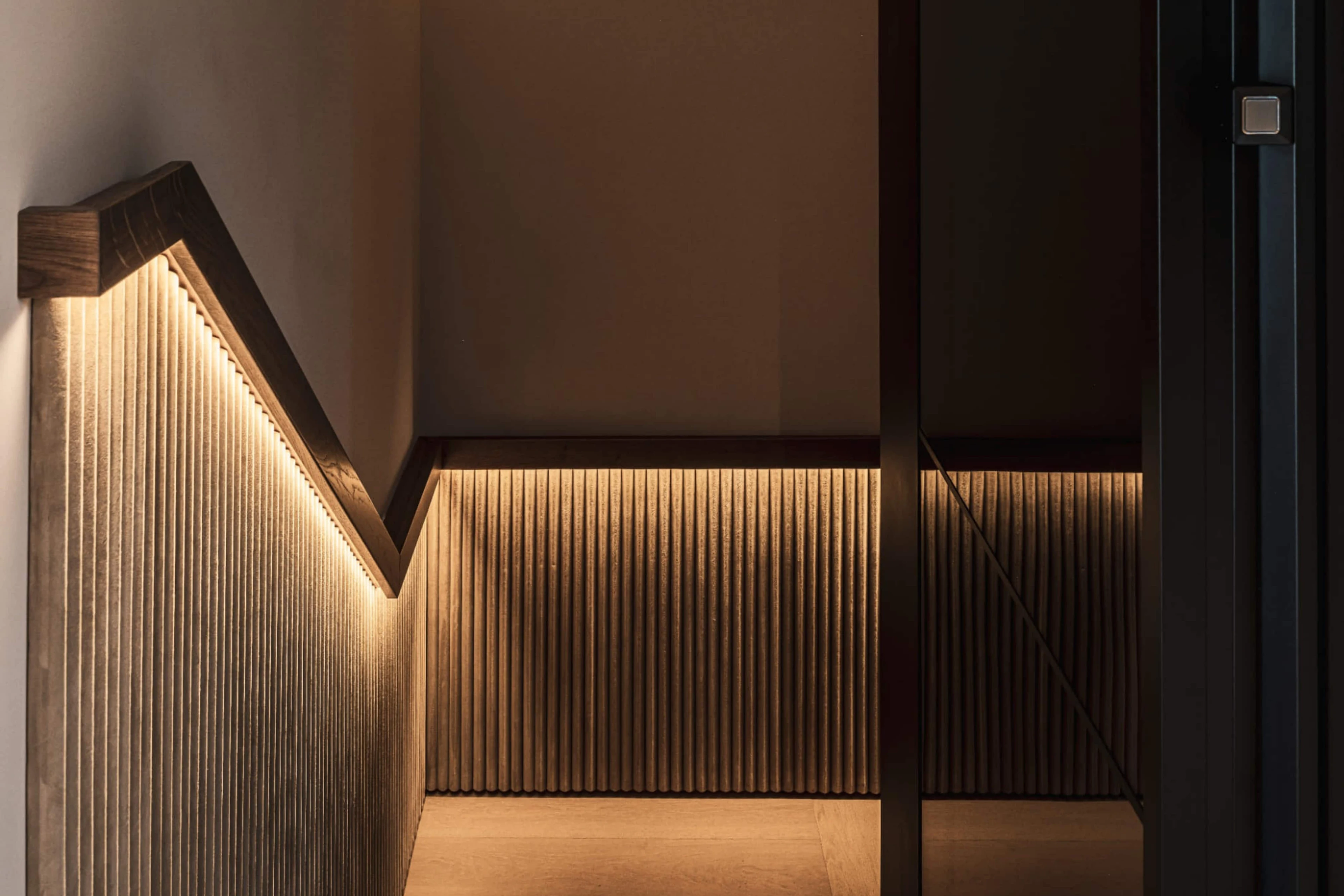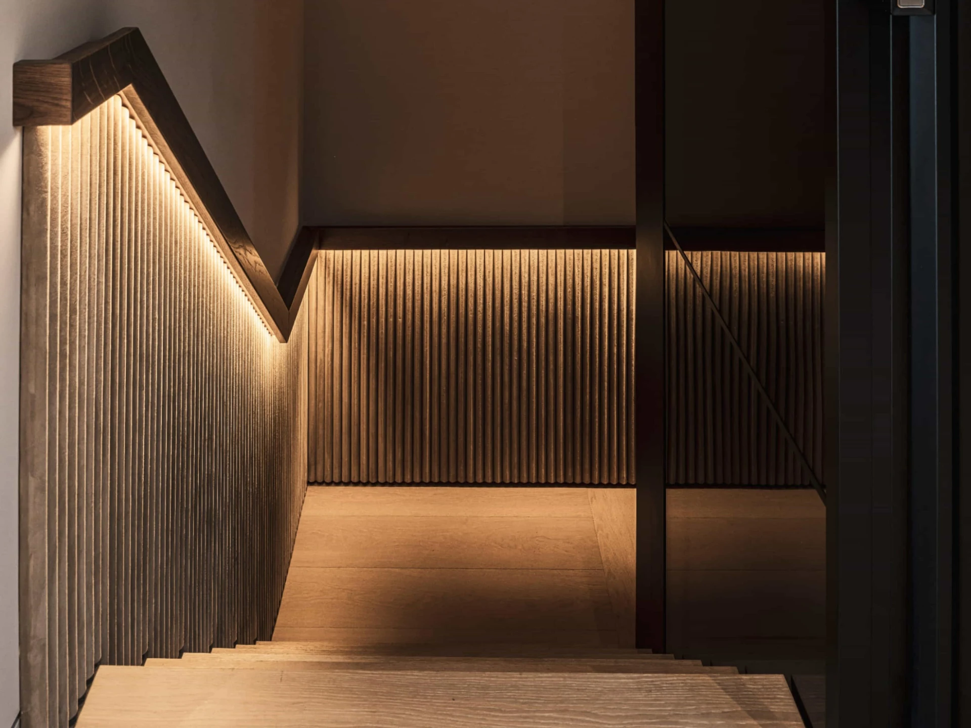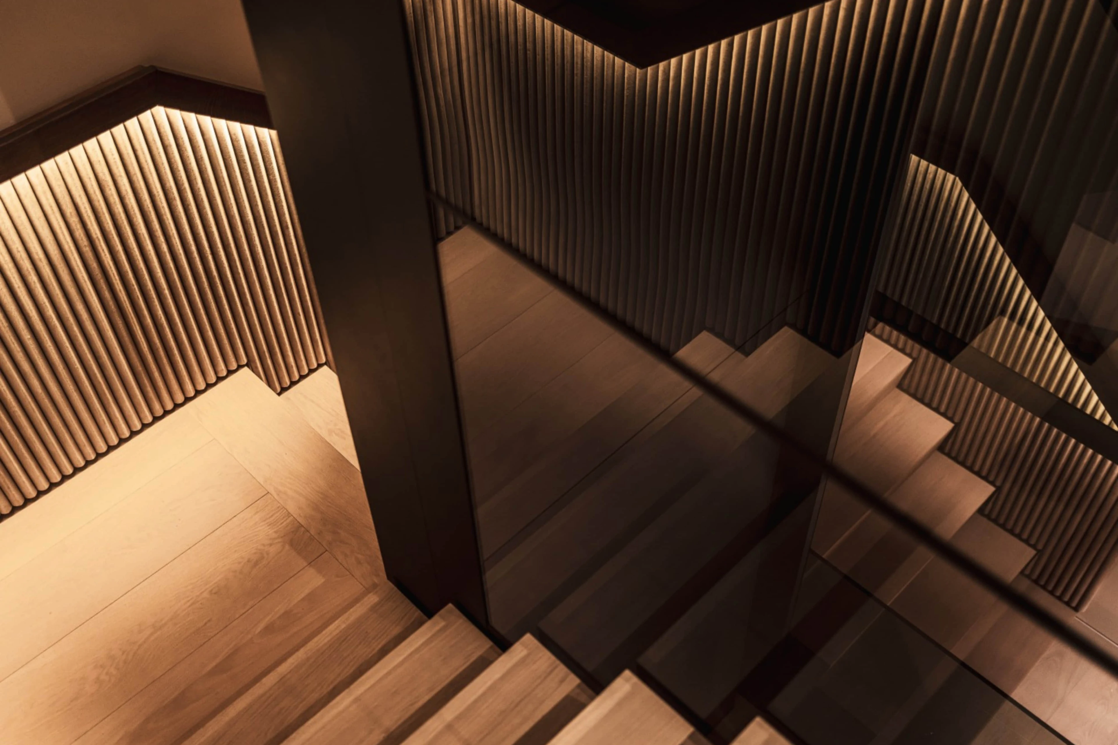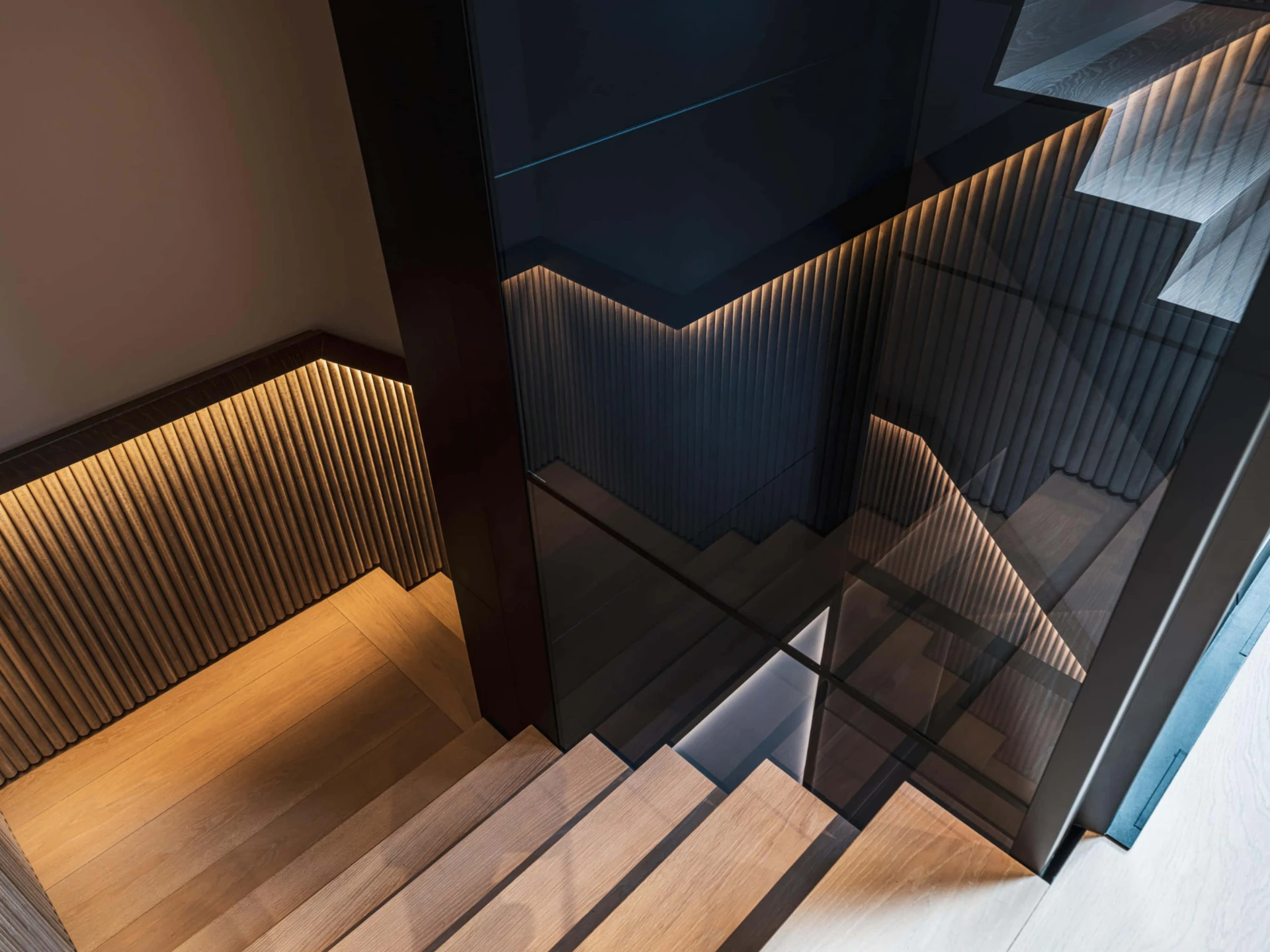 Rondom lift geconstrueerde ztrap, met minimalistische belijning, ingefreesde verlichting en halfhoge houten lamellenwand.