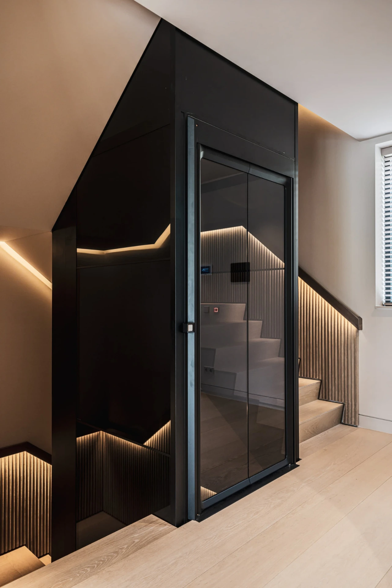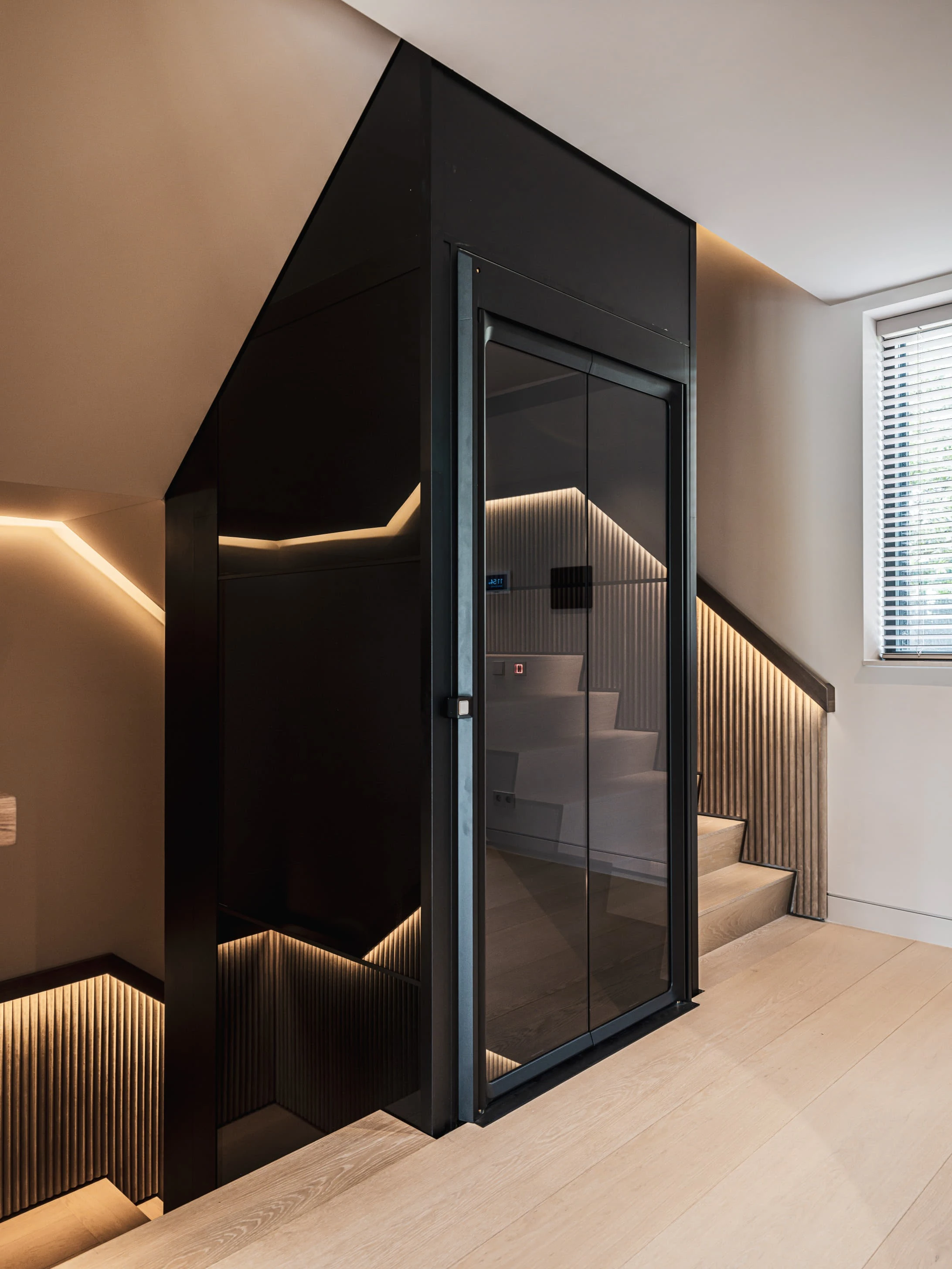 U ziet een trap die zich voegt naar de ruimte – niet als object, maar als onderdeel van de architectuur. De lift is geen toevoeging, maar het ankerpunt van het ontwerp.