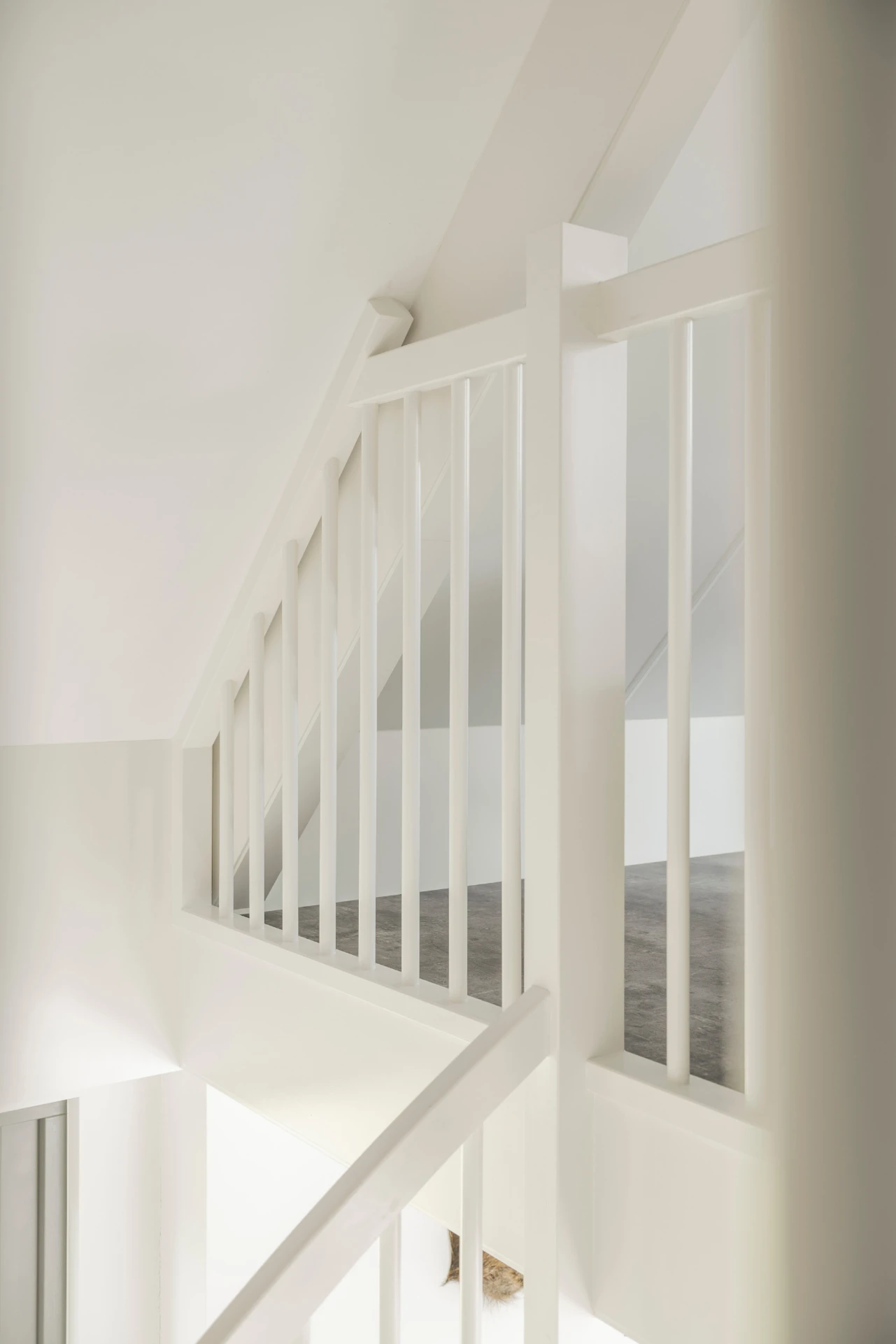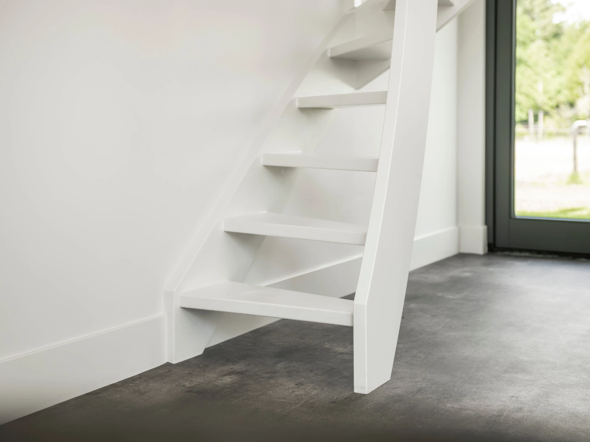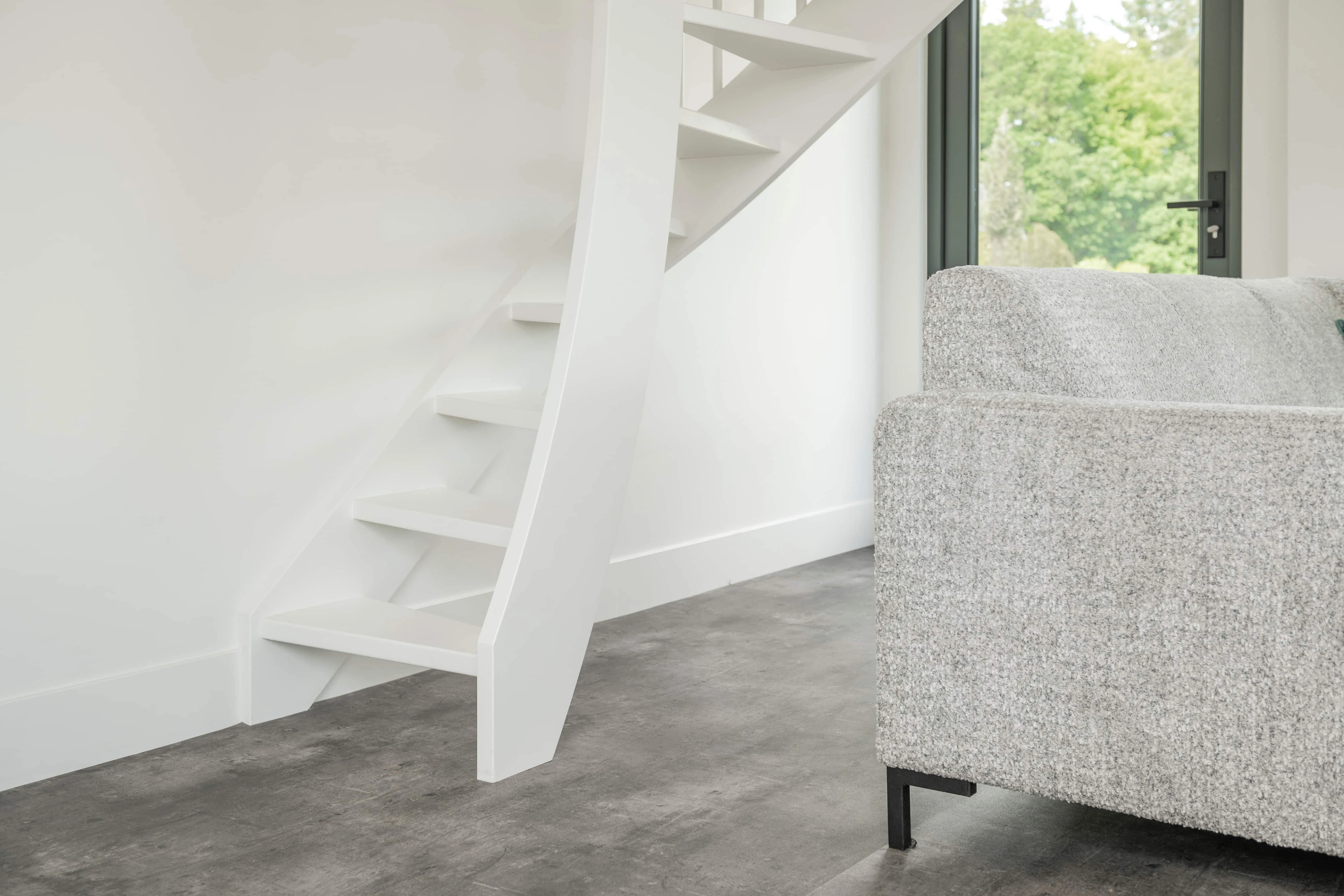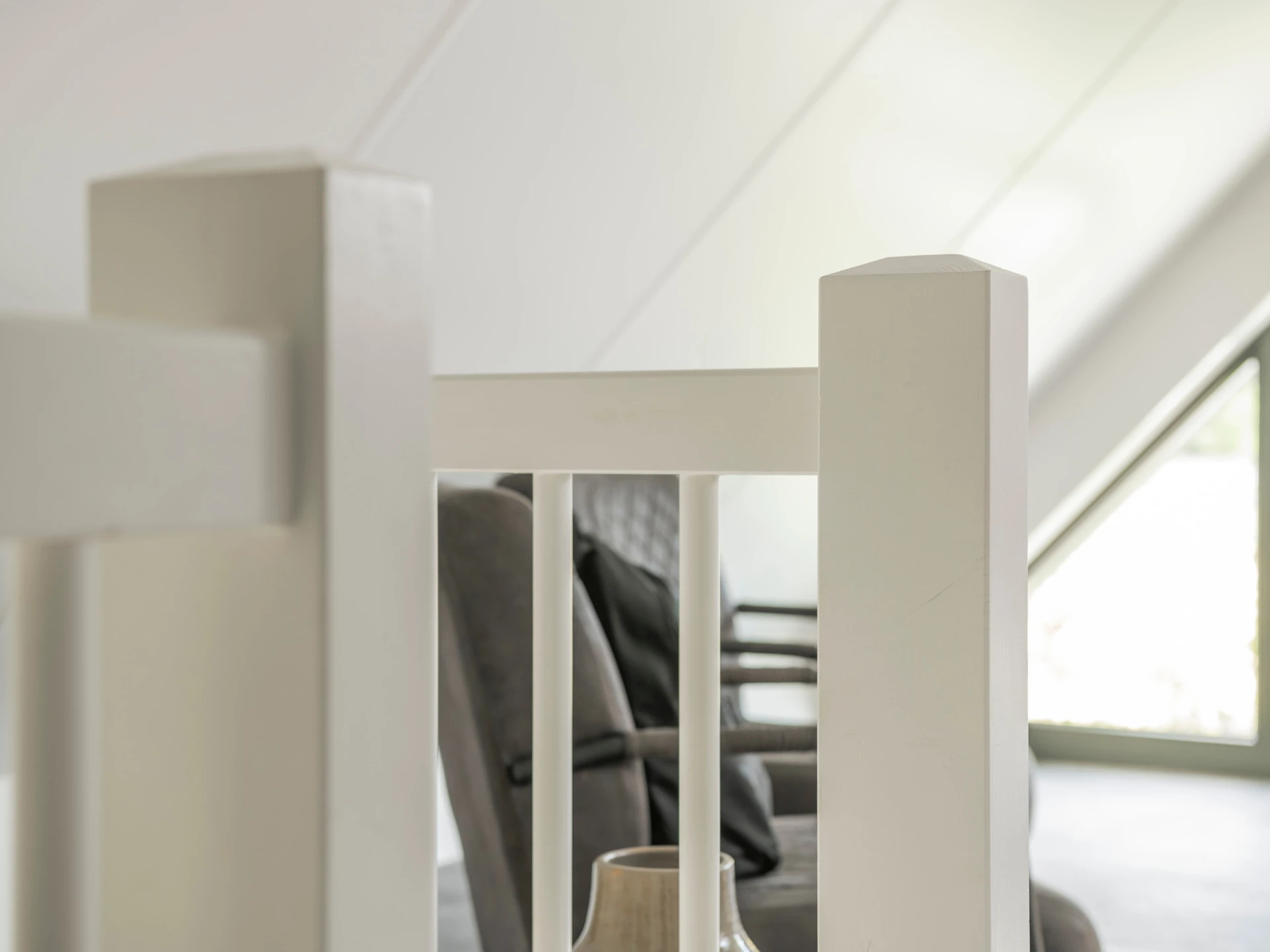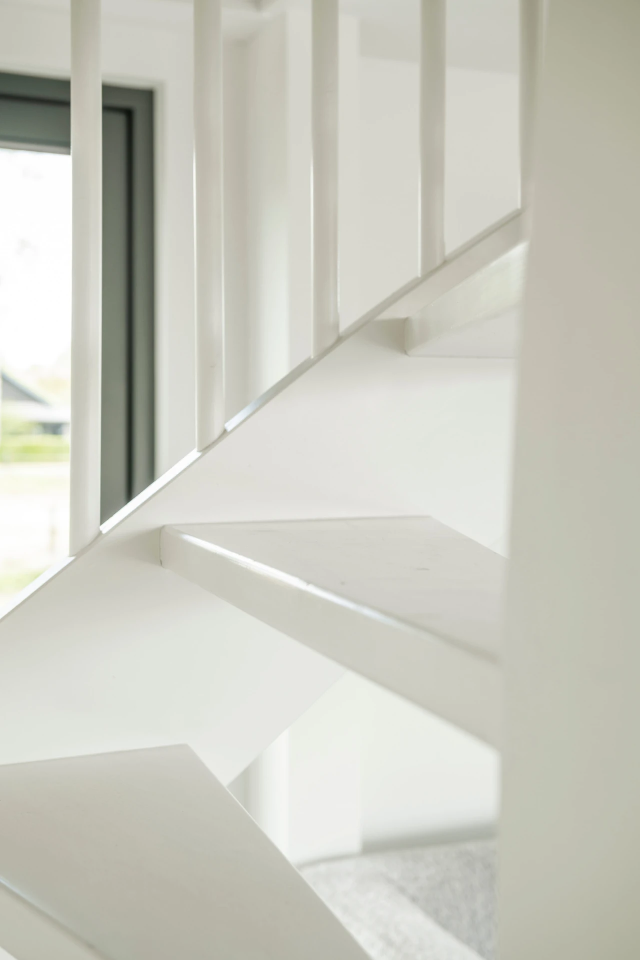 Hout, volledig witgelakt. Open treden in massief hout, spijlenhekwerk en trapbomen strak afgewerkt in RAL 9010.