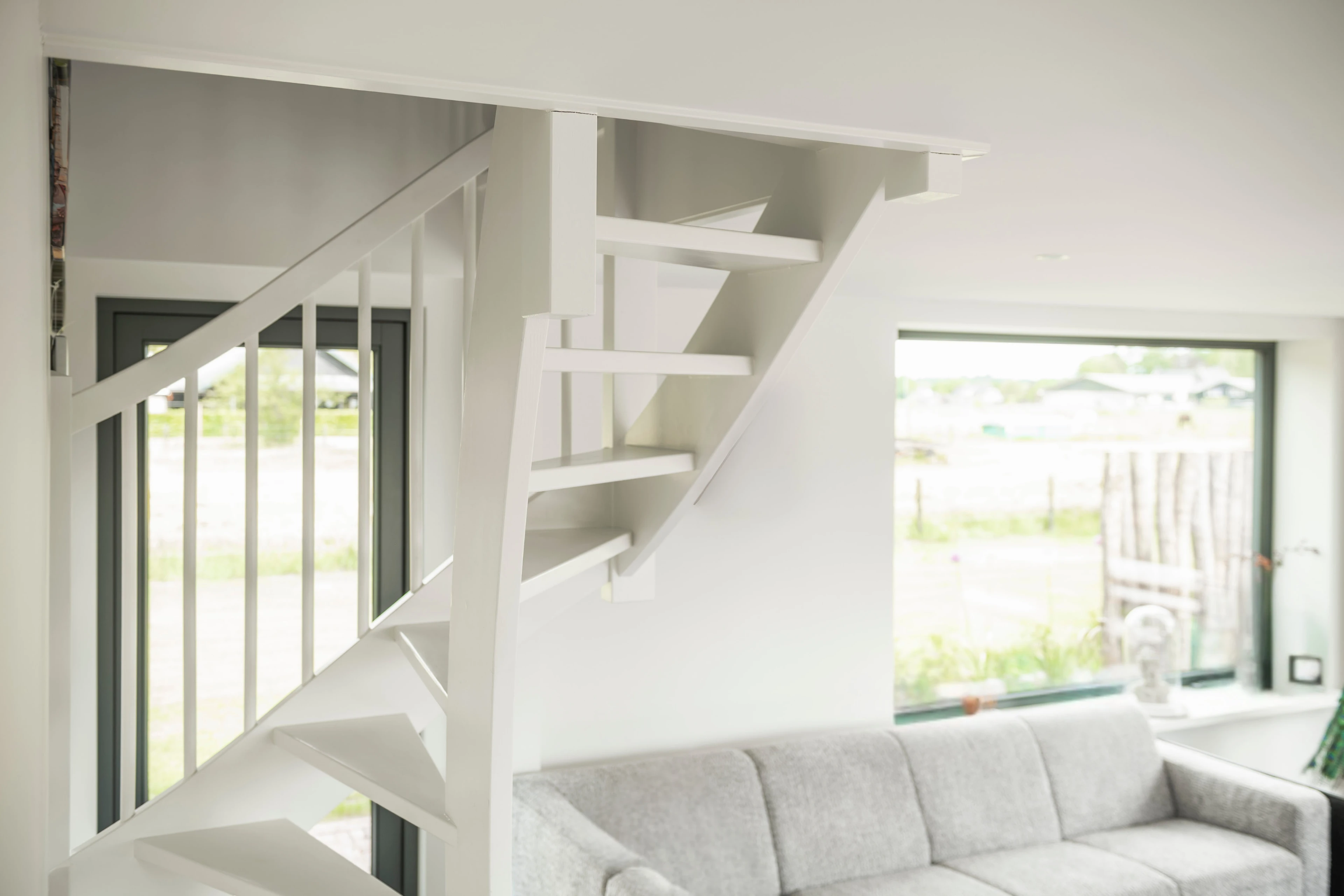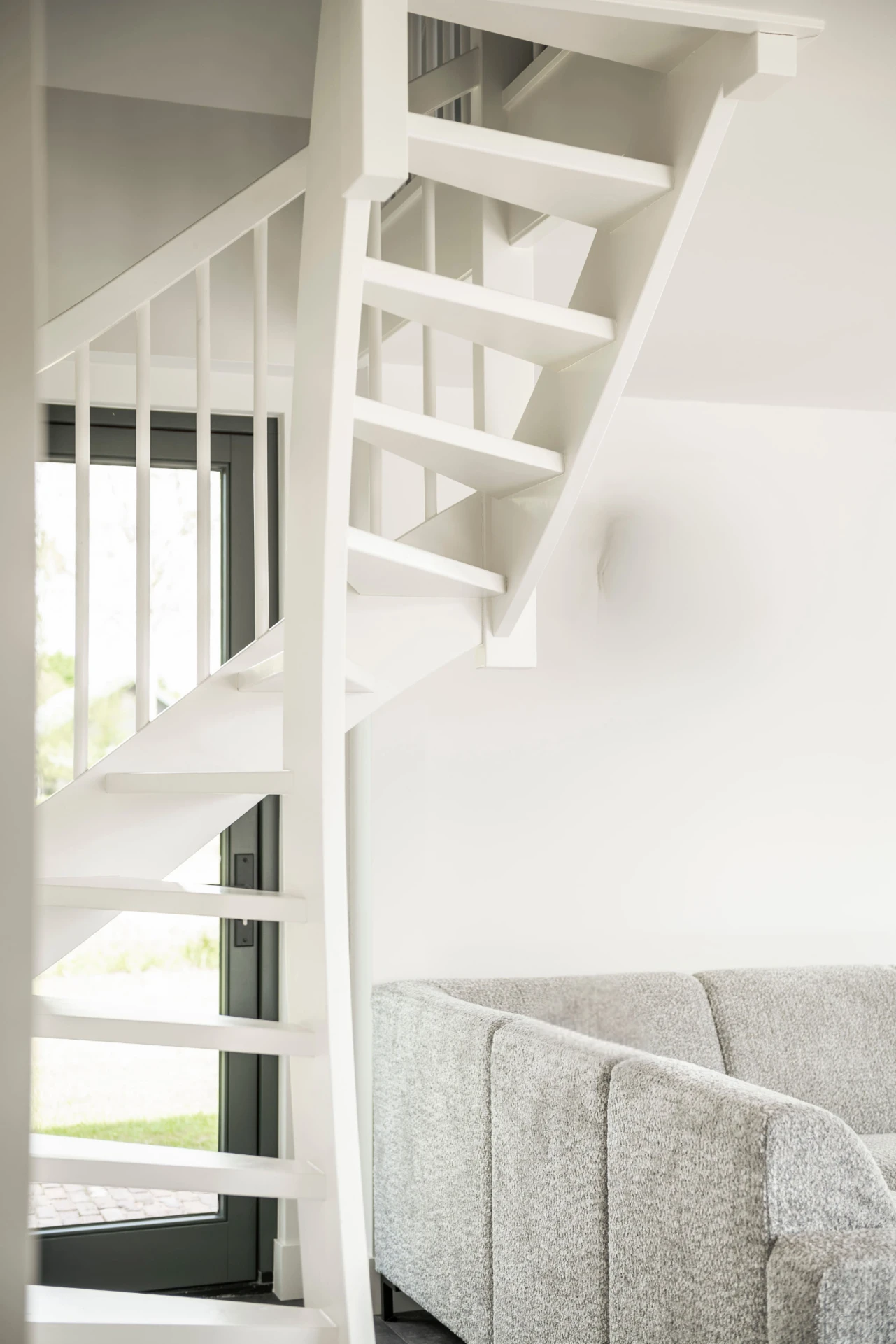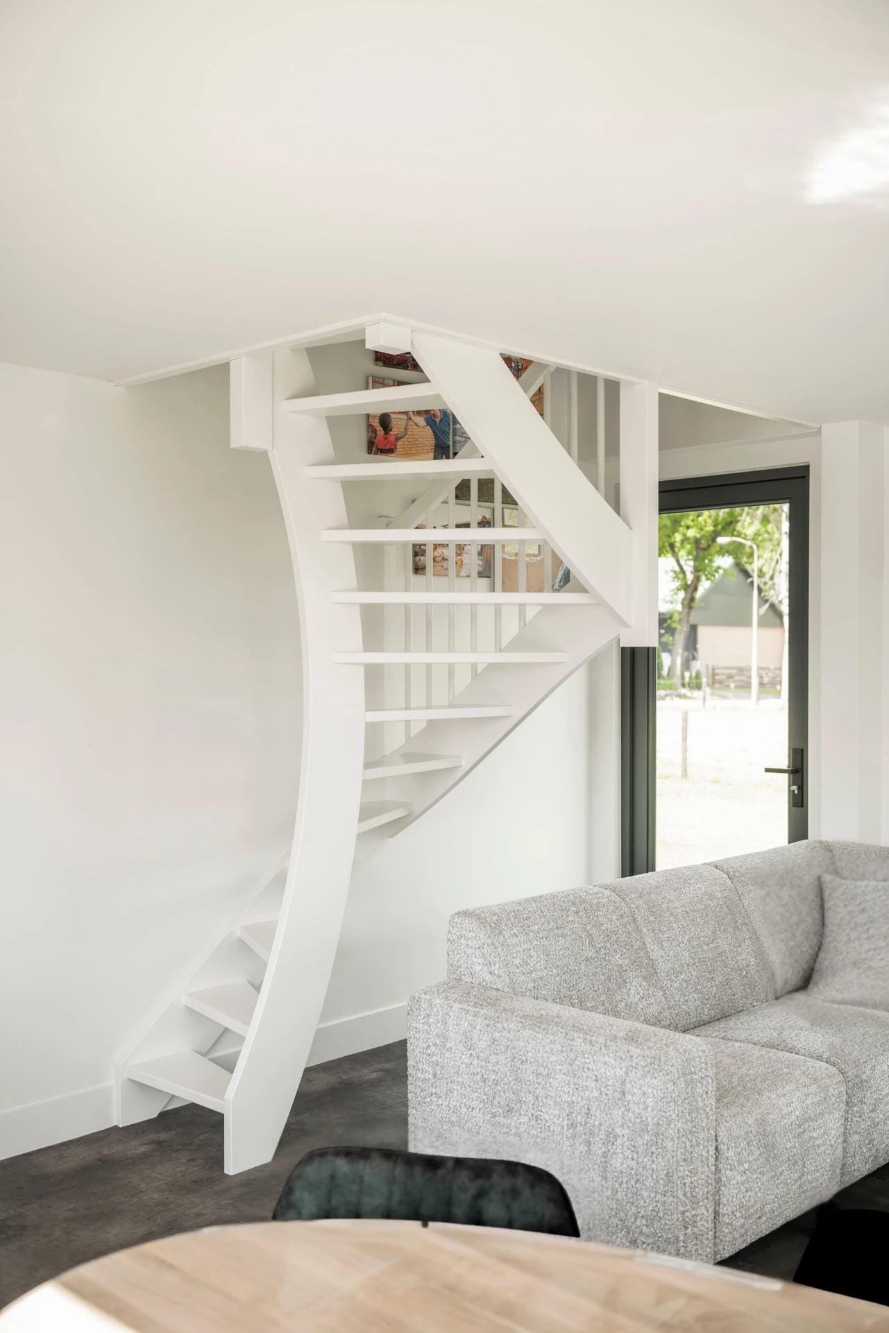 Deze ruimtebesparende trap is ontworpen voor efficiëntie zonder concessies aan stijl. De boemerangvorm zorgt voor vloeiende beweging in een compacte opstelling. Open treden geven lucht, terwijl het witte spijlenhekwerk voor ritme zorgt. Een lichte, heldere trap die past in elke vierkante meter met karakter.