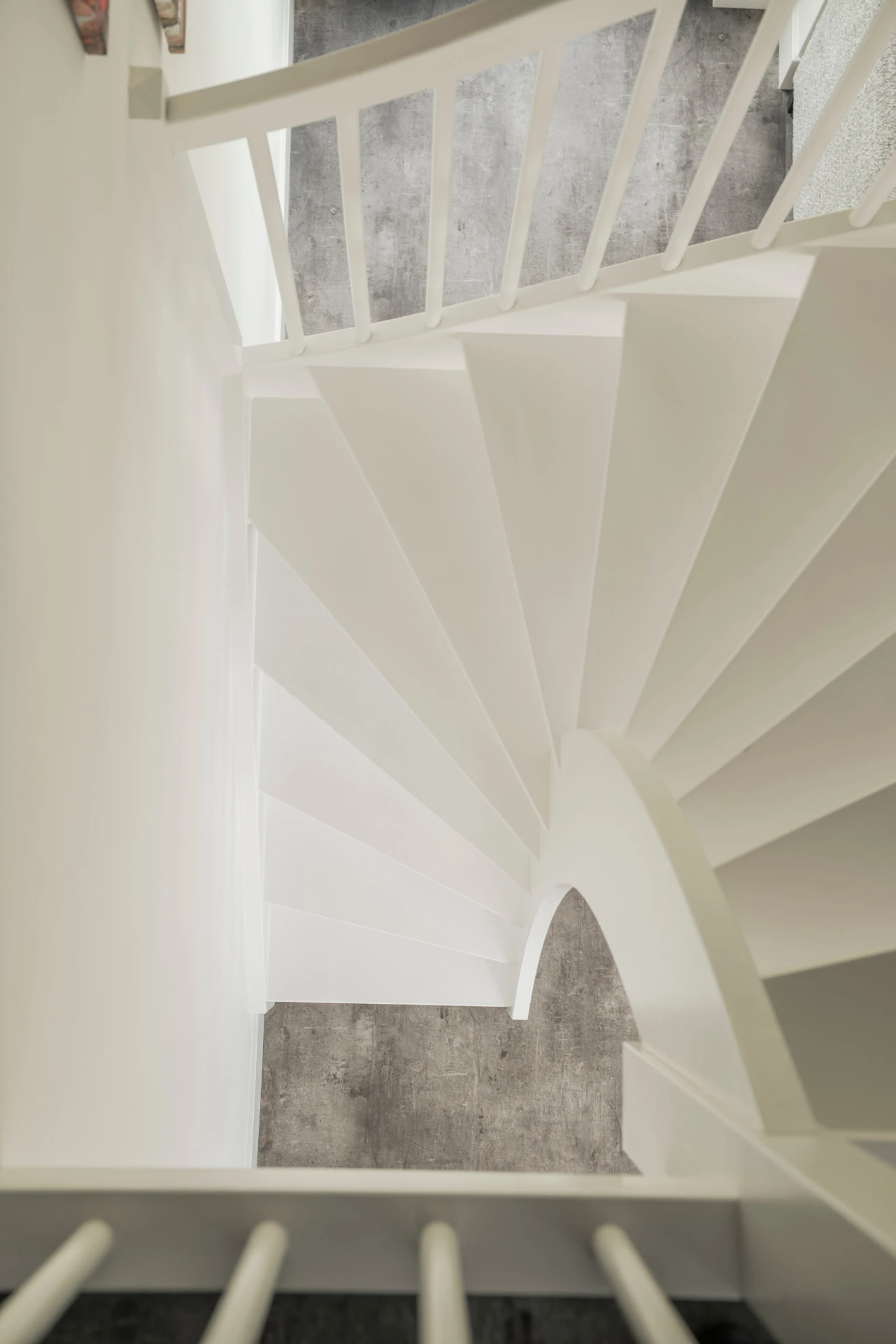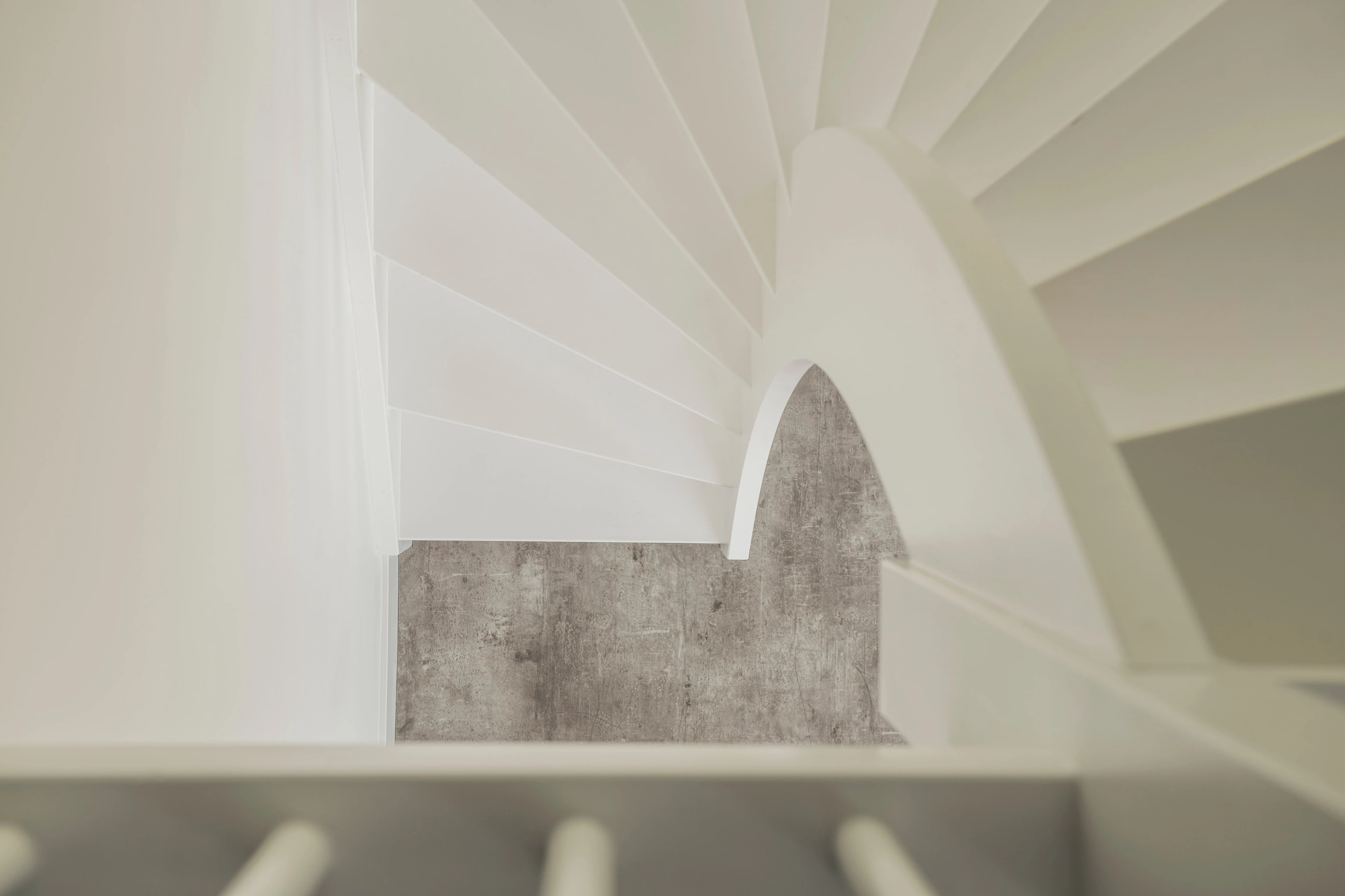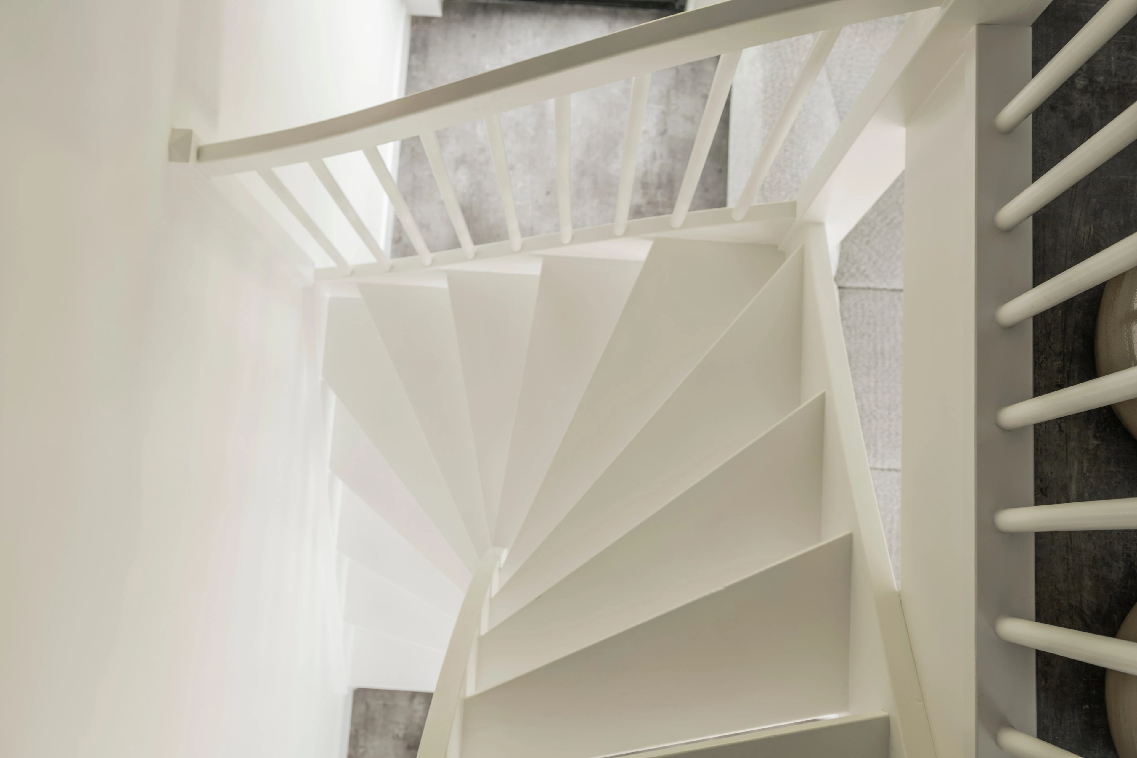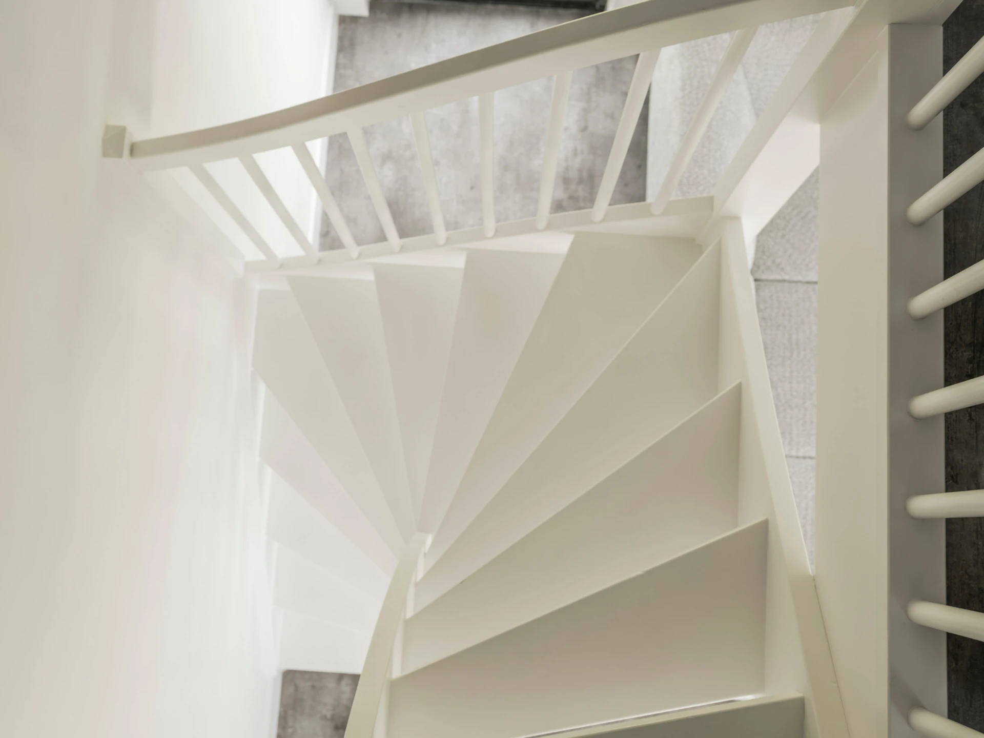 Deze ruimtebesparende trap is ontworpen voor efficiëntie zonder concessies aan stijl. De boemerangvorm zorgt voor vloeiende beweging in een compacte opstelling. Open treden geven lucht, terwijl het witte spijlenhekwerk voor ritme zorgt. Een lichte, heldere trap die past in elke vierkante meter met karakter.