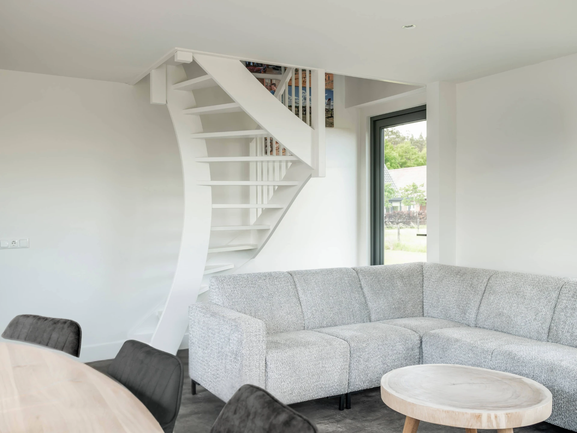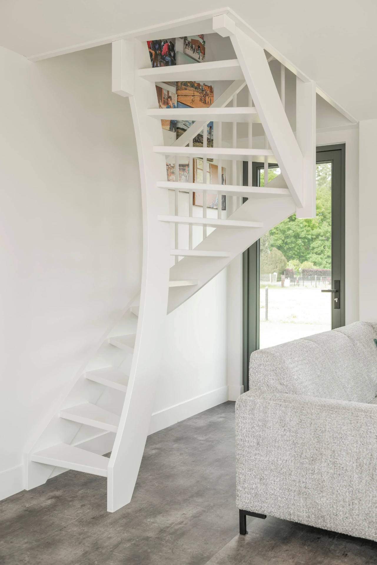 U ziet een compacte trapoplossing met open structuur en een speelse vorm. Licht, functioneel en verrassend krachtig in uitstraling.
